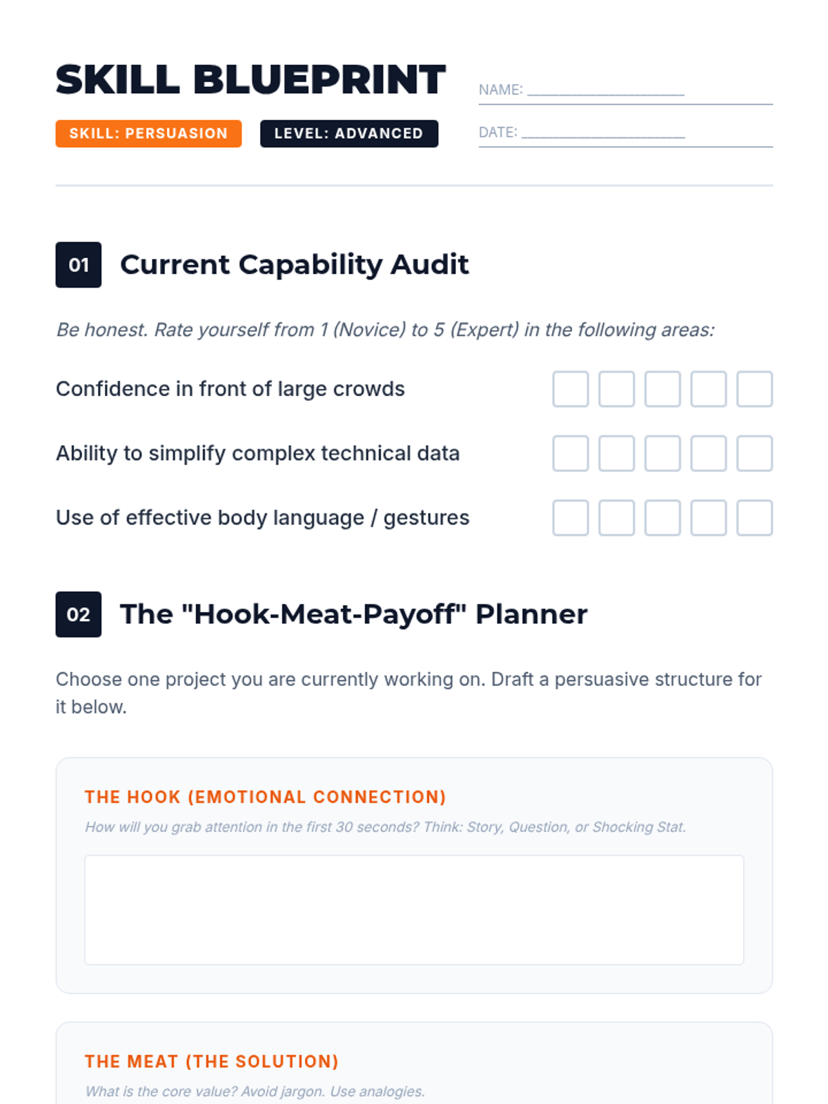 A student worksheet designed to help college students audit their communication skills and plan a persuasive pitch using the Hook-Meat-Payoff framework.
