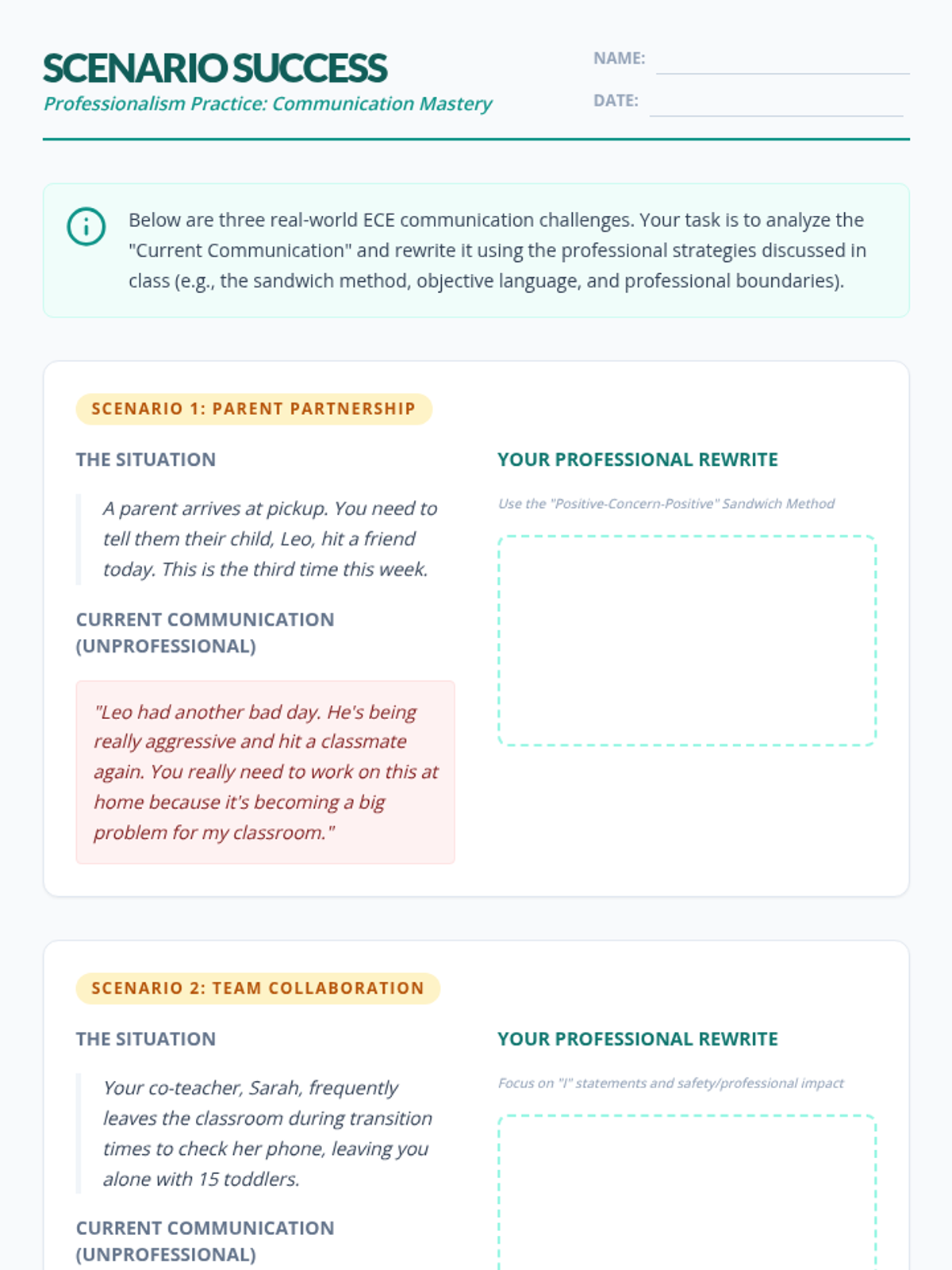 A student-facing worksheet featuring three realistic ECE scenarios (parent communication, colleague conflict, and digital boundaries) for analysis and professional rewriting.