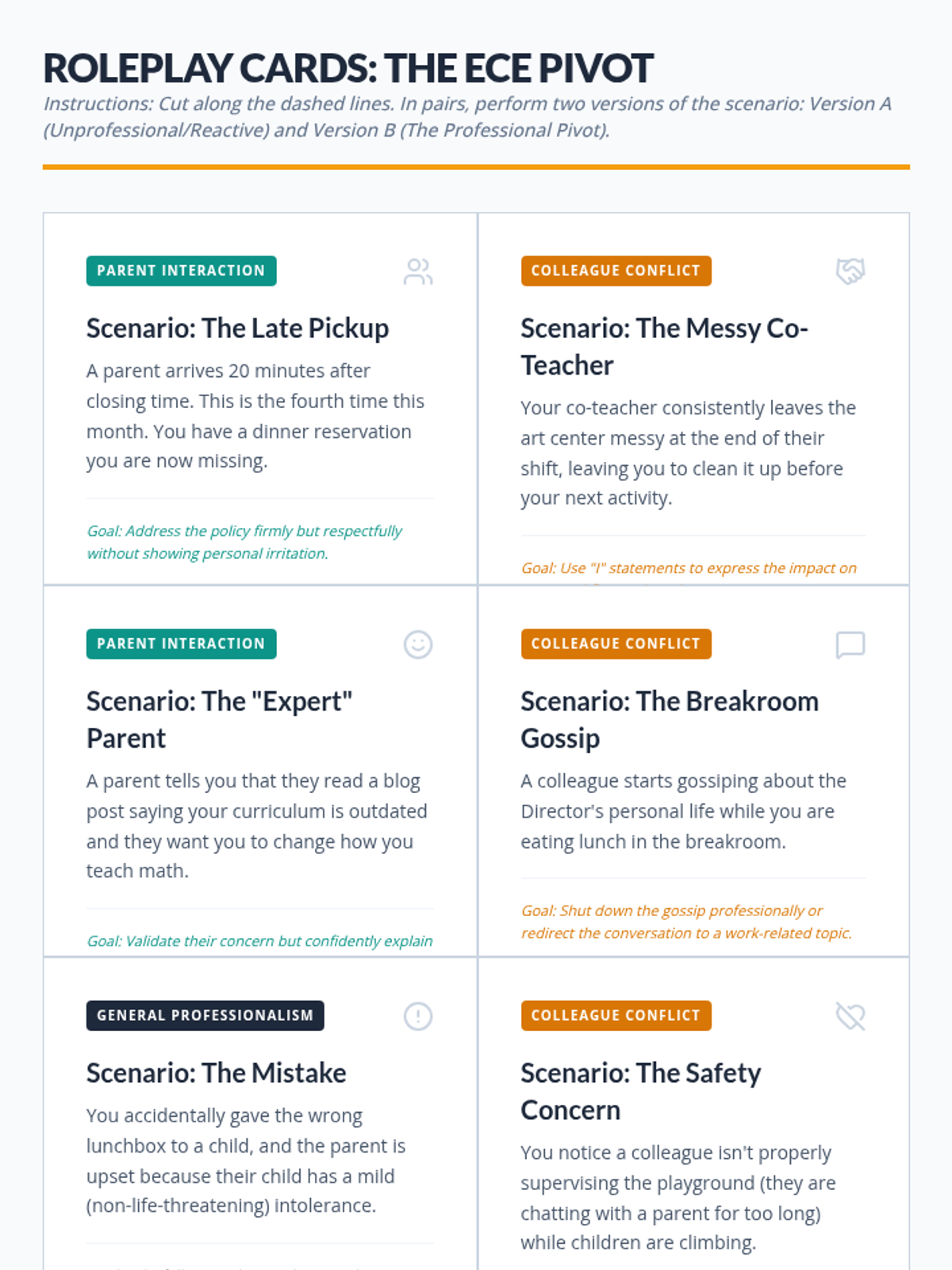 A set of six realistic roleplay scenarios for ECE students to practice professional communication pivots with parents and colleagues.