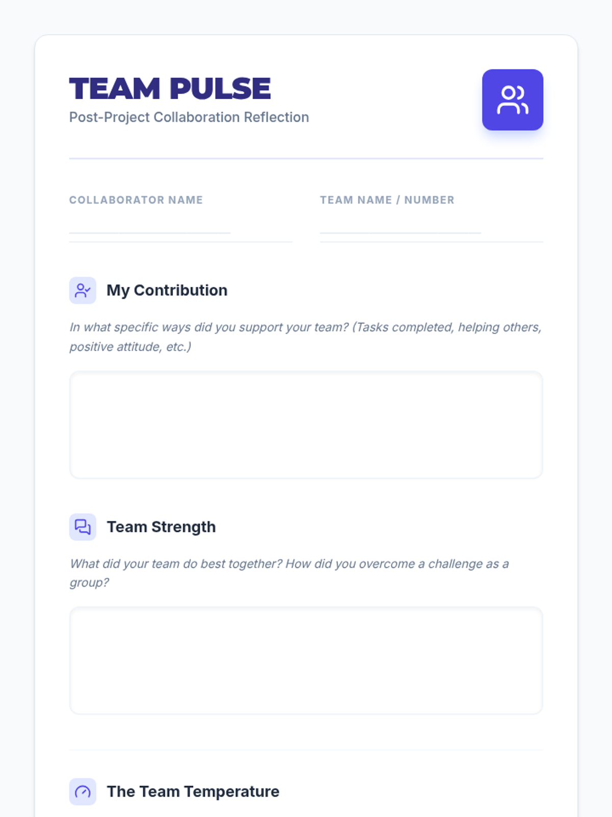 A refined, modern reflection sheet for project teams, featuring clear prompts for personal contribution, team strengths, and numerical rating scales for communication and workload. Designed for clean printing and easy student use.