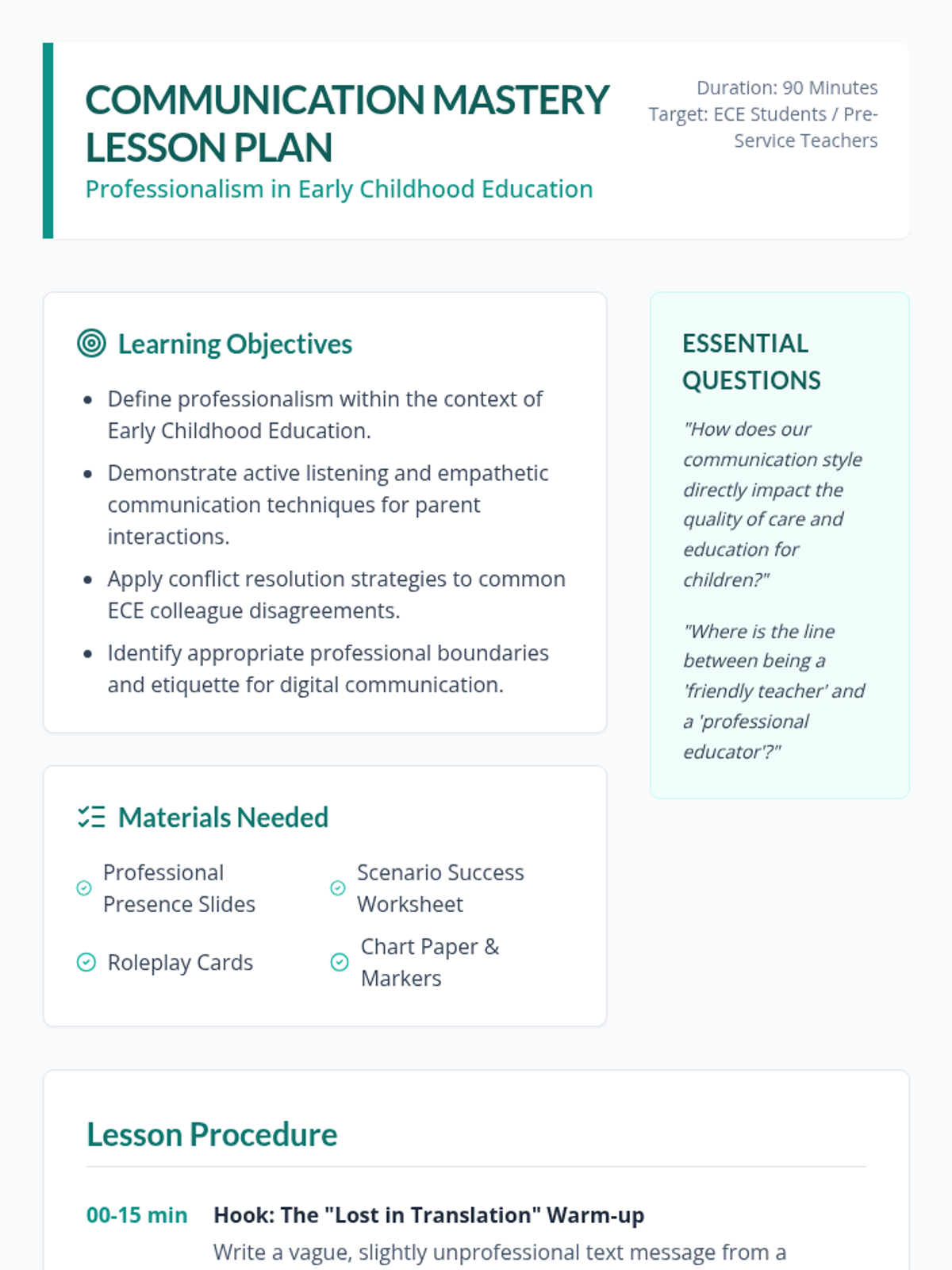 A detailed lesson plan for educators teaching professionalism in Early Childhood Education, featuring learning objectives, a timed procedure, and specific teaching strategies for parent and colleague communication.