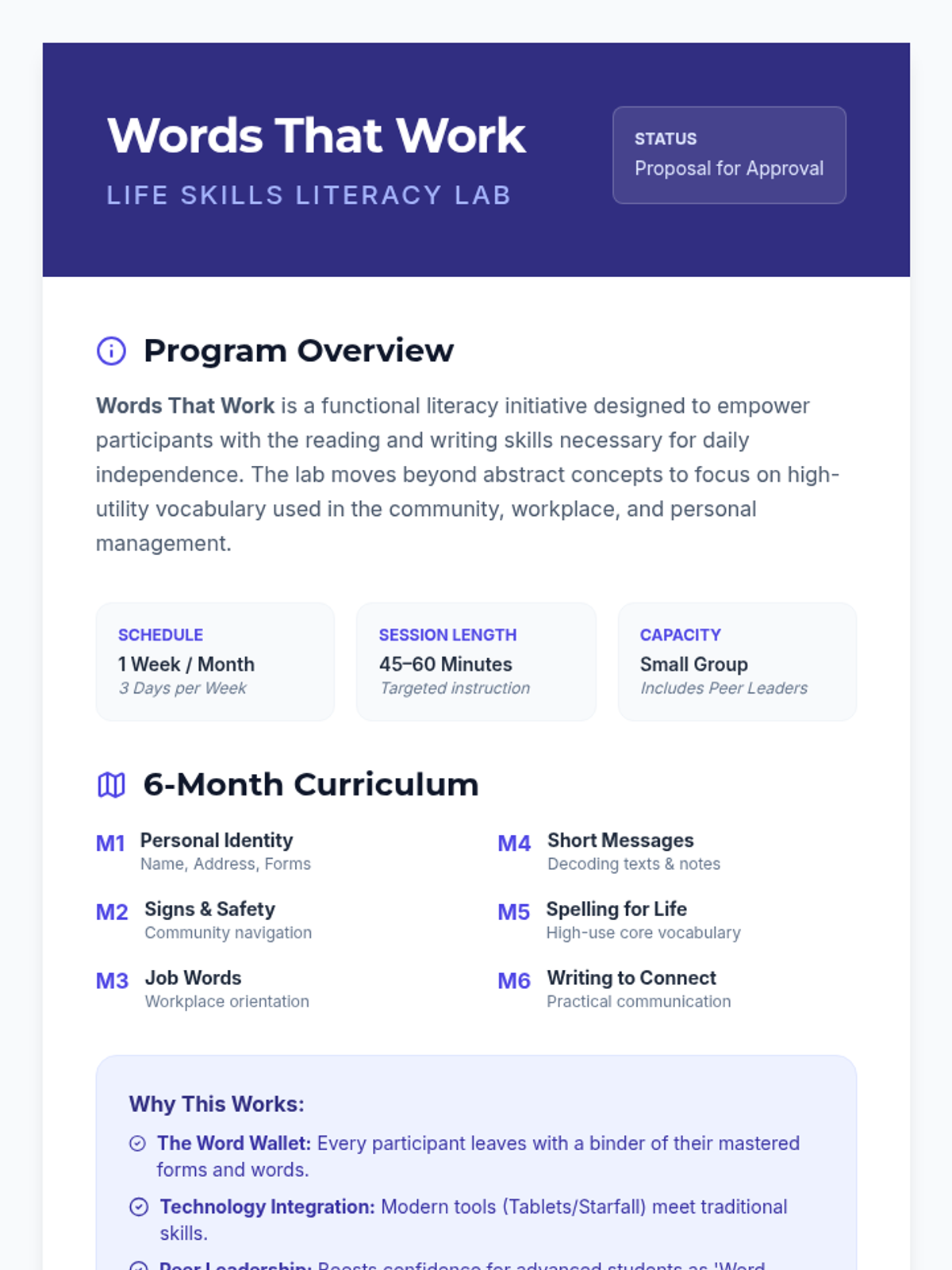 A professional 2-page proposal and lesson guideline for the 'Words That Work' program. It features the 6-month curriculum roadmap, a detailed breakdown of the 5-part instructional framework, and a concrete example lesson for 'My Name & Identity'. This version uses a rhythmic chant warm-up instead of magnets.
