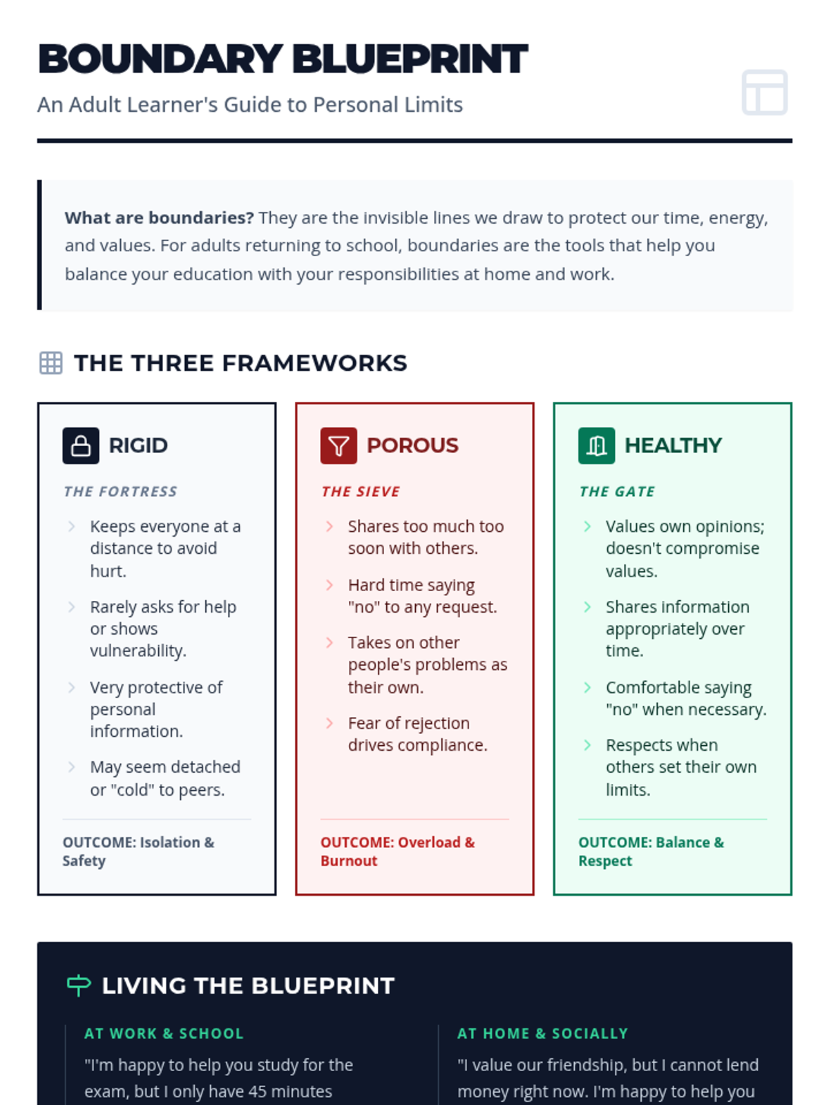 A professional one-page informational guide for adult learners explaining the differences between rigid, porous, and healthy boundaries using a 'blueprint' theme. Includes visual comparisons, real-world examples, and practical tips for setting personal limits.