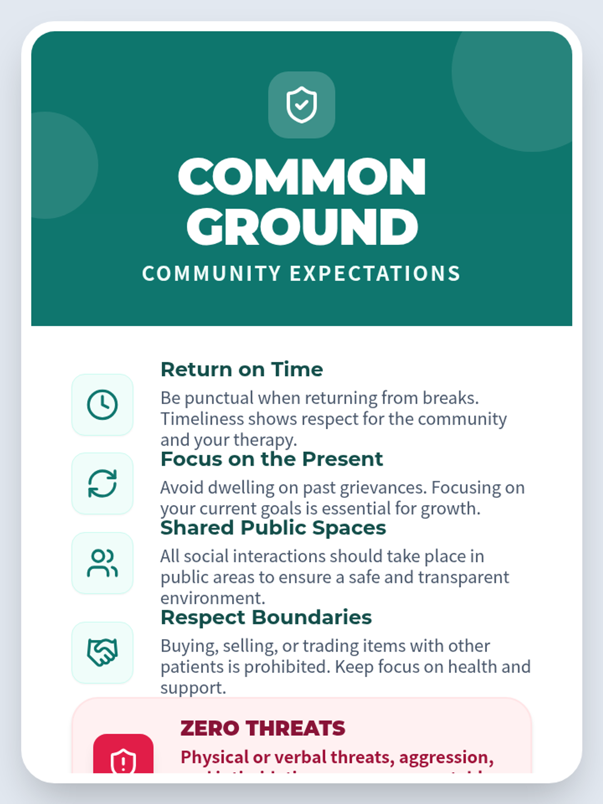 A polished, high-contrast poster outlining five essential community expectations for a therapeutic setting, using clear icons and a professional teal-and-rose color palette.