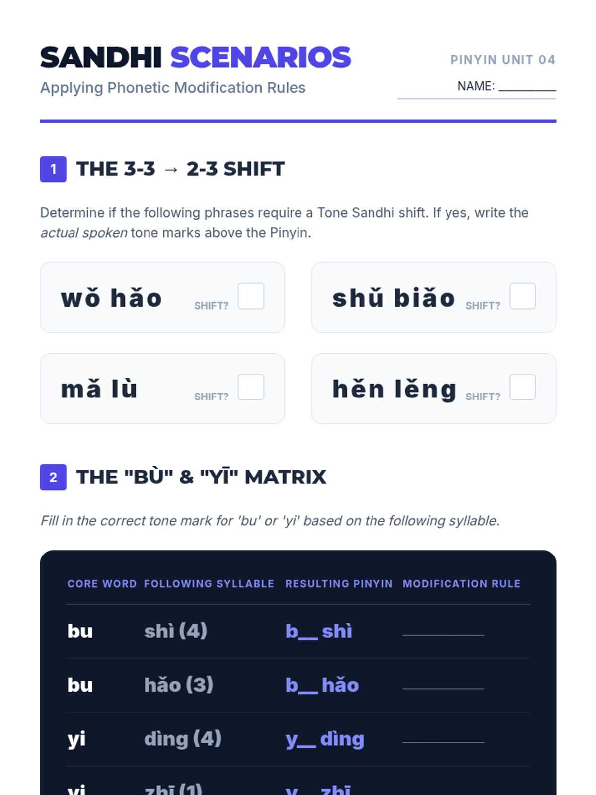 A practice worksheet for tone modification rules, including 3rd tone sandhi checks and 'bu'/'yi' shifts.