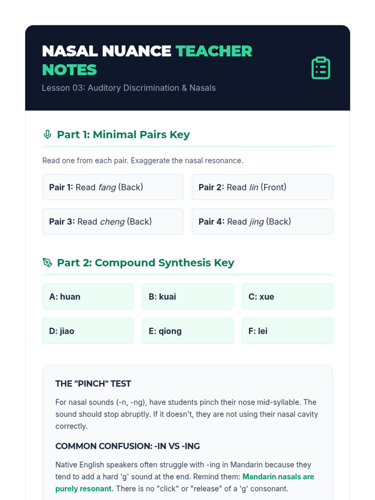 Teacher reference guide for the Nasal Nuance lesson, providing the dictation key for minimal pair exercises and compound final transcriptions.