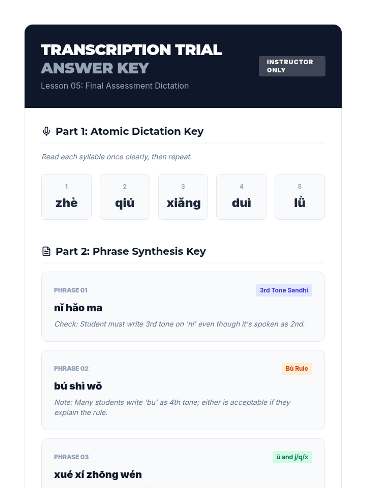Instructor answer key and scoring rubric for the Lesson 05 Transcription Trial, including atomic and phrase dictation prompts.
