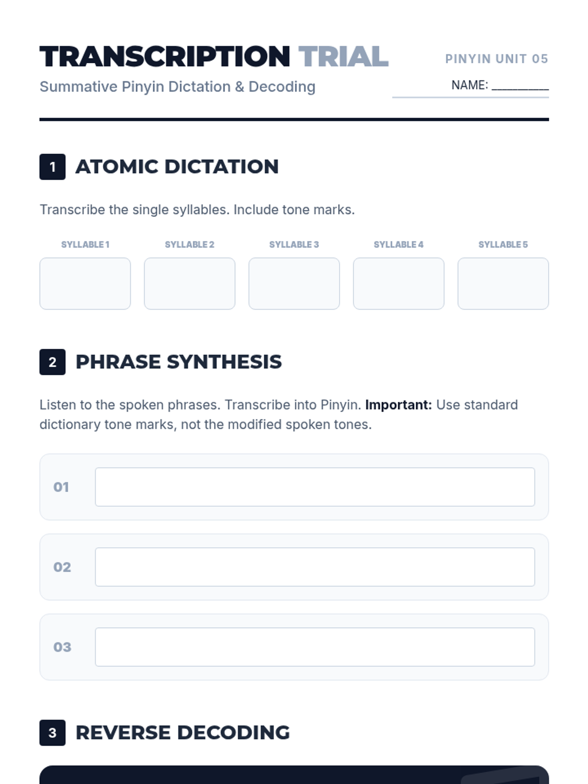 A summative transcription worksheet for Lesson 05, featuring atomic dictation, phrase synthesis, and a reverse decoding challenge.