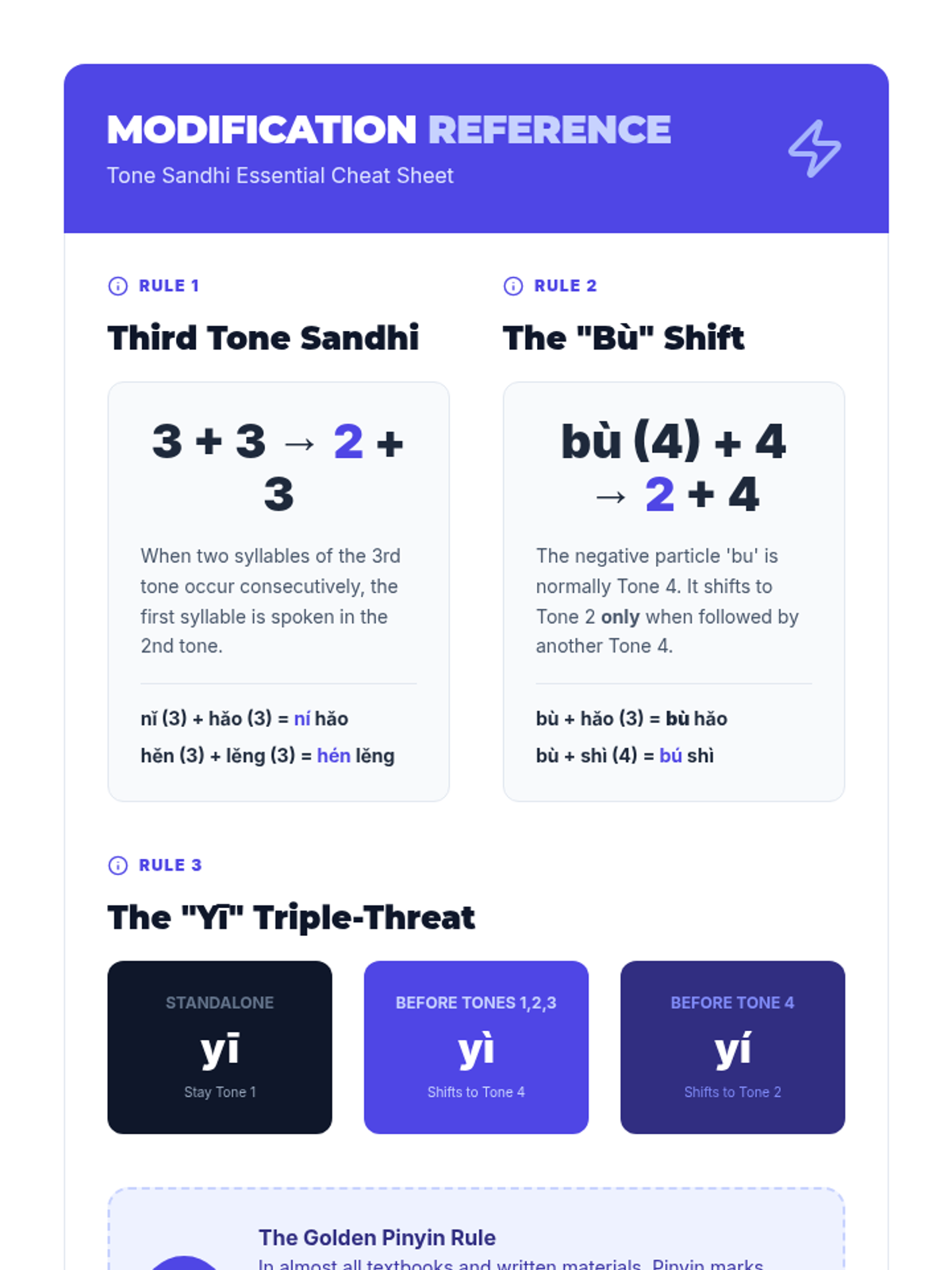 A quick-reference sheet summarizing tone sandhi rules for 3rd tones, 'bu', and 'yi', designed for student use during speaking practice.