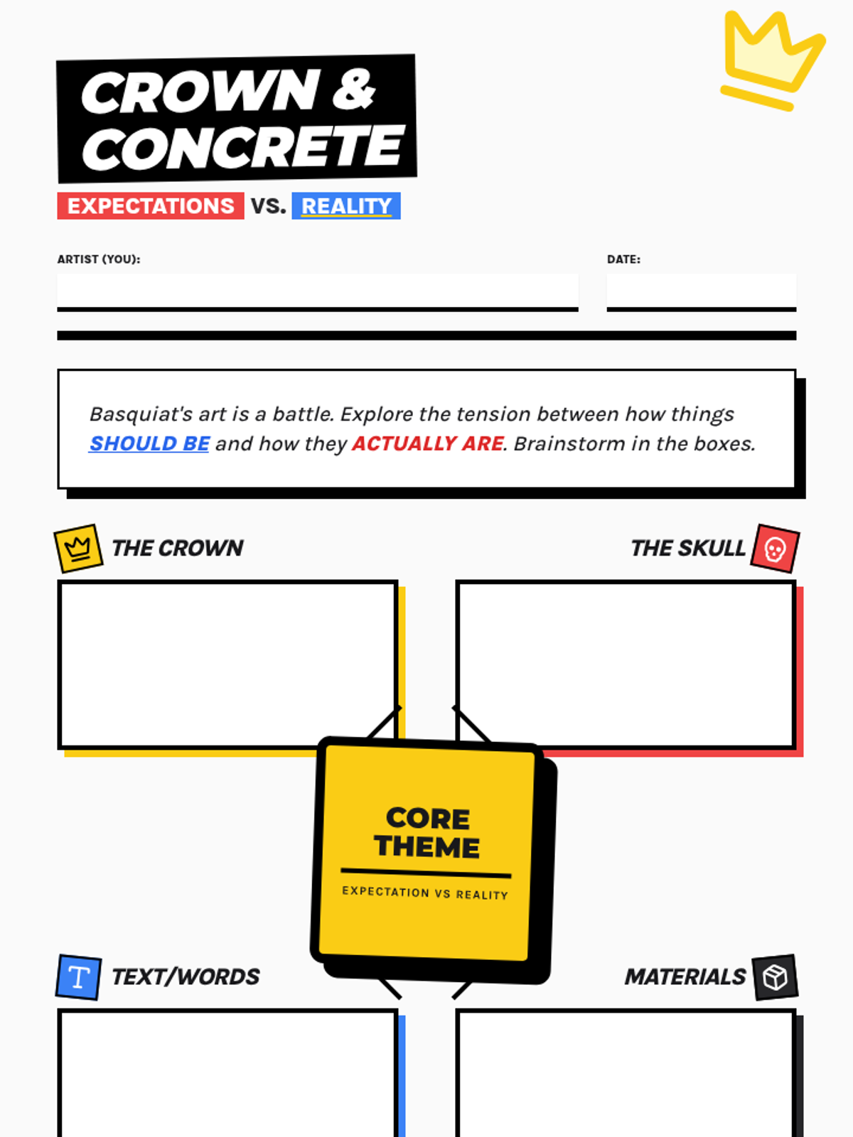 A two-page thematic brainstorming worksheet centered on Jean-Michel Basquiat's art style, featuring a central mind map to explore recurring motifs like crowns and skulls, followed by a deep reflection on societal expectations versus reality.