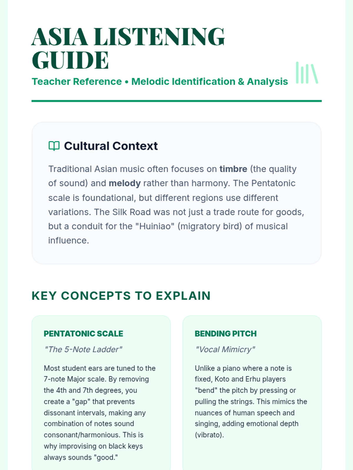 Teacher reference guide for Lesson 2, providing cultural context, scale theory, suggested listening tracks, and discussion prompts for Asian musical traditions.