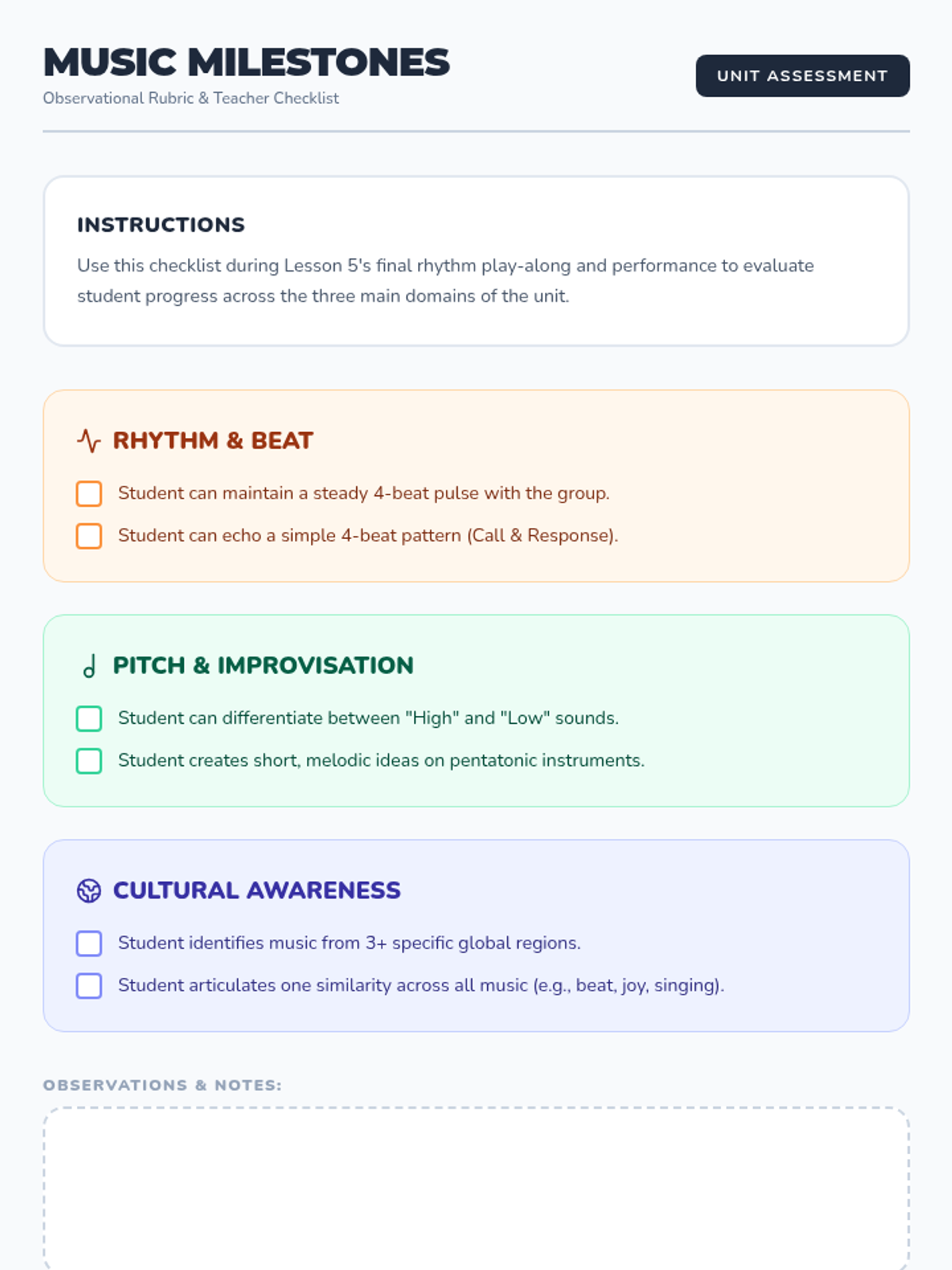 An observational rubric for teachers to assess Kindergarten students' musical and cultural proficiency at the end of the global music sequence.