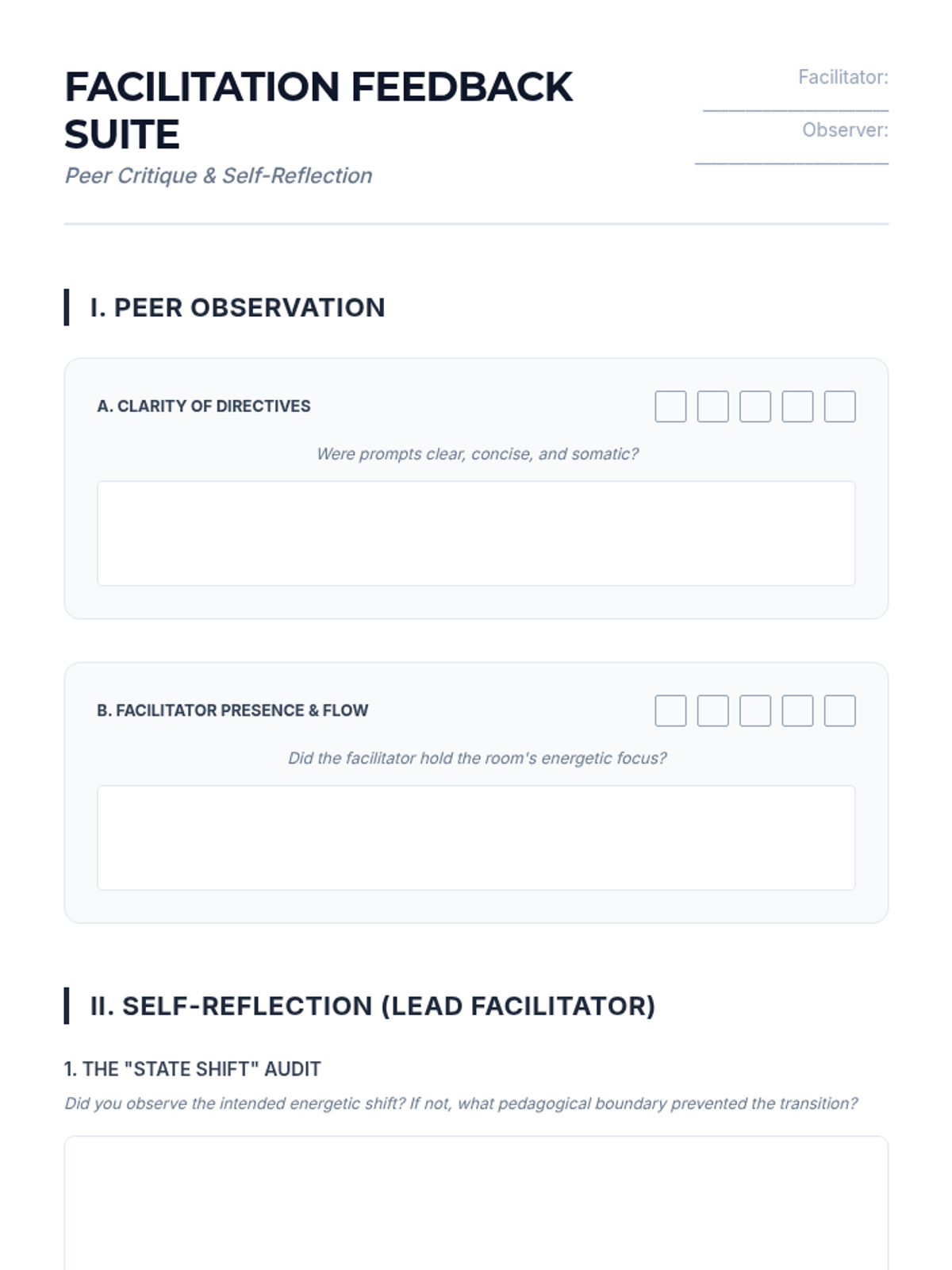 Comprehensive feedback and reflection tool for both peer observers and the lead facilitator following the practicum session.