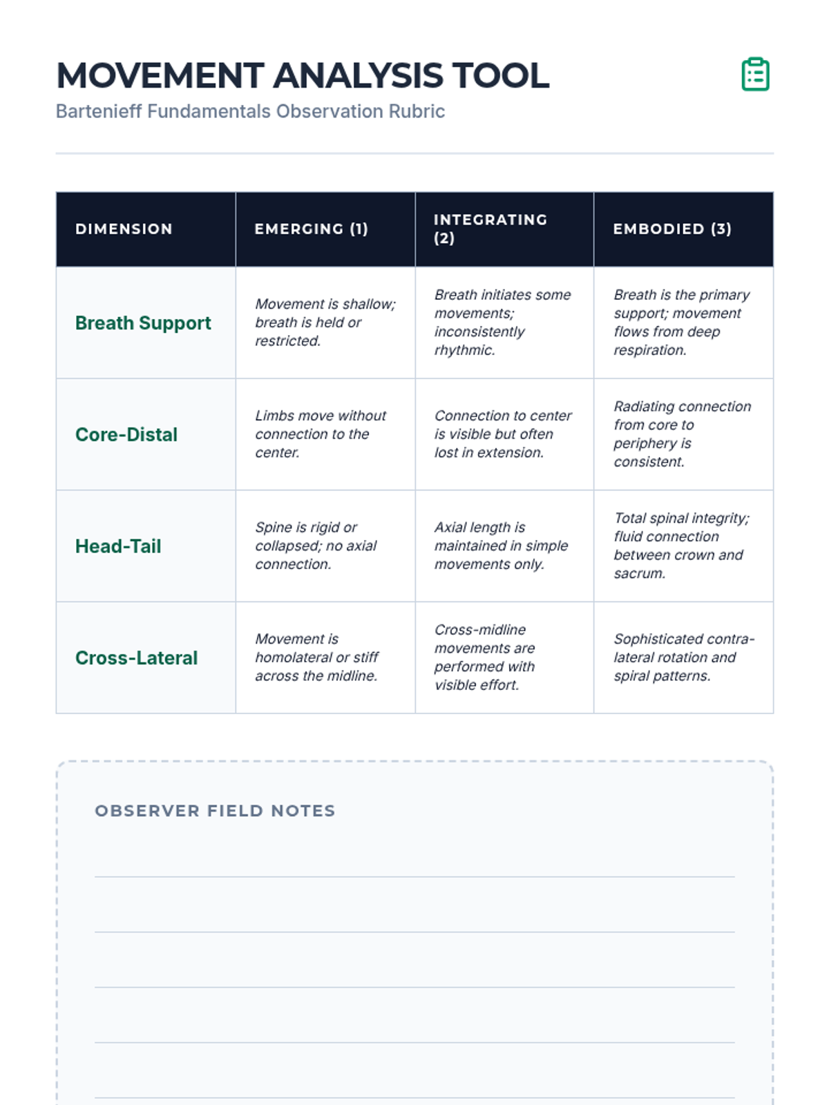 Observation rubric for teachers and students to assess movement patterns based on Bartenieff Fundamentals.