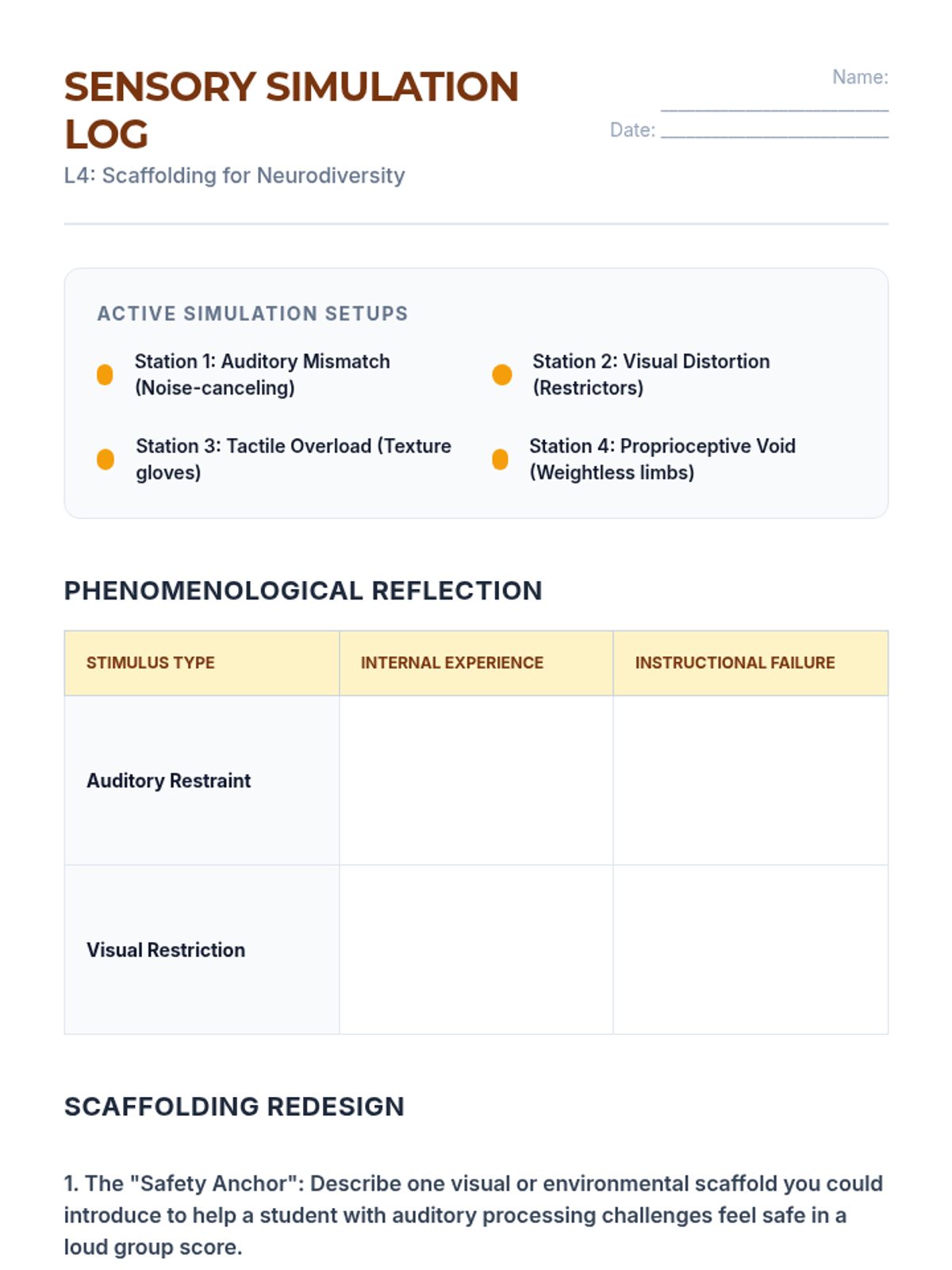 Logbook for students to record their experiences during sensory processing simulations and reflect on pedagogical scaffolds.