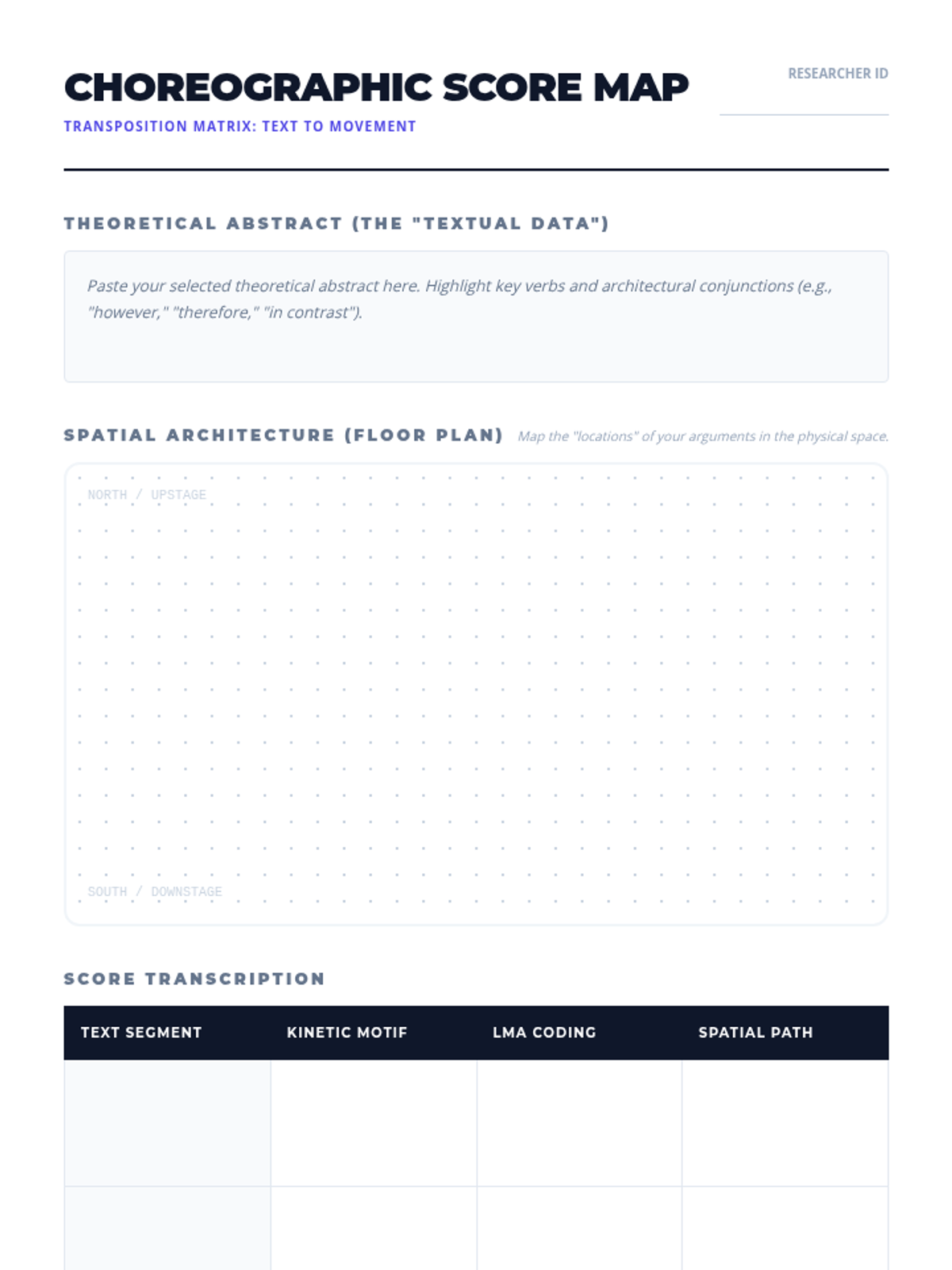 Worksheet for mapping a theoretical text to a choreographic score, featuring a spatial floor plan area and a detailed transcription table.