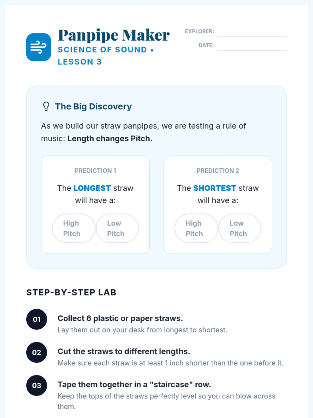 Student activity worksheet for Lesson 3, guiding students through a panpipe construction experiment with straws, pitch predictions, and material analysis.