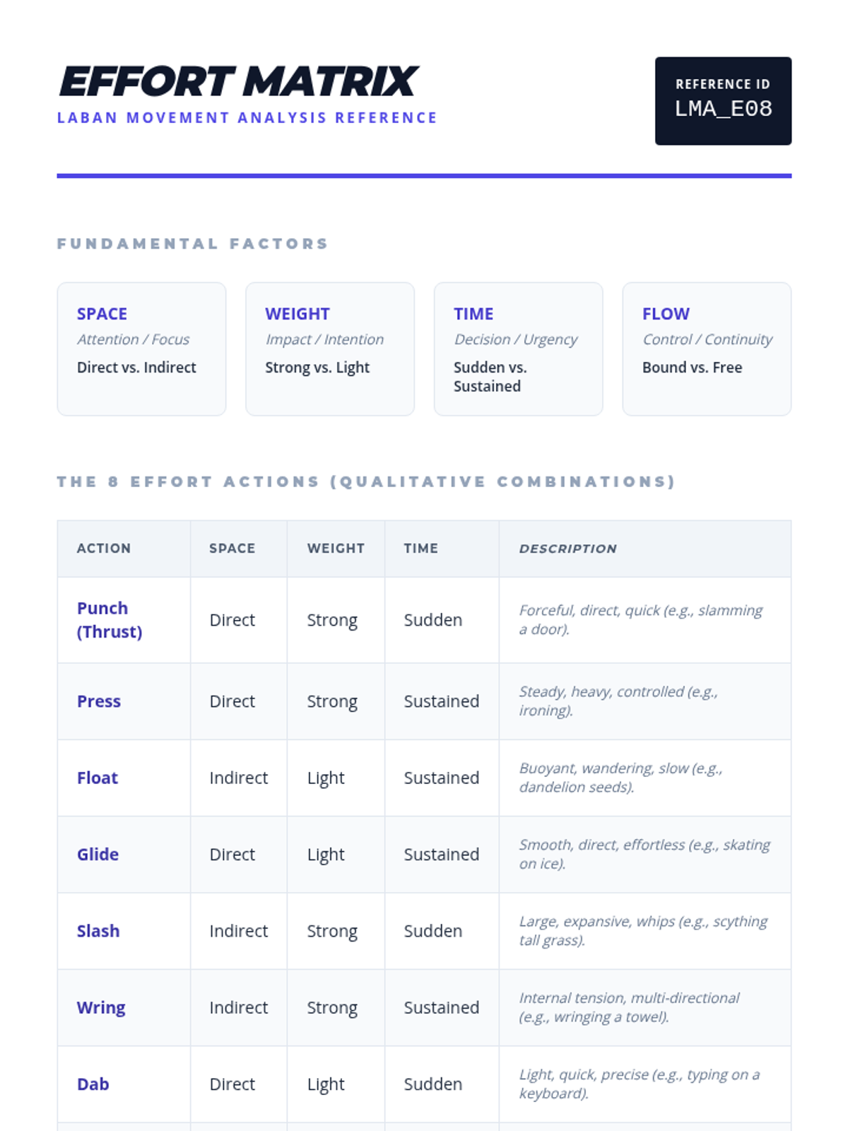 Reference sheet detailing the Laban Effort factors and the eight Effort actions for movement analysis.