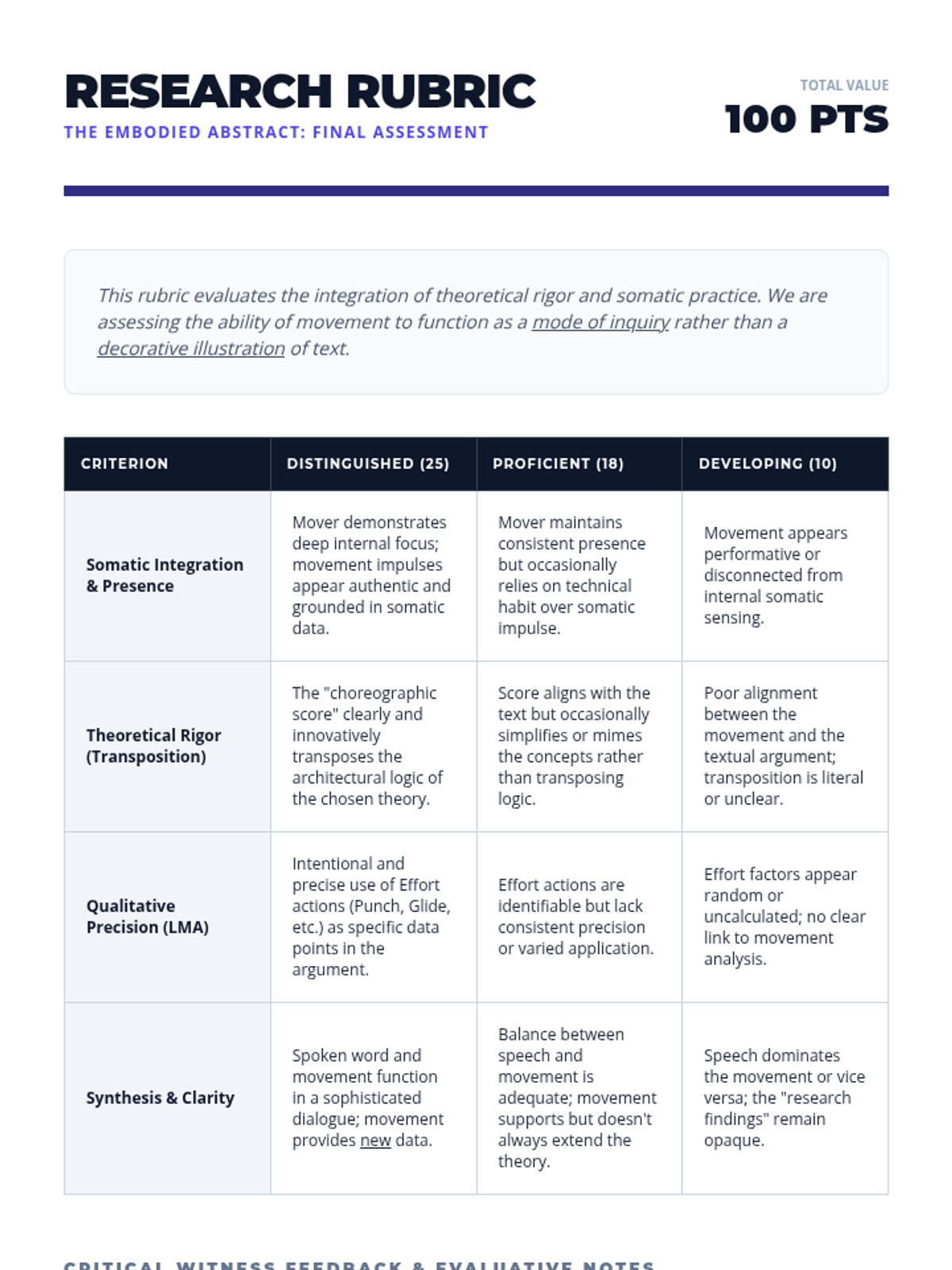 Research-focused assessment rubric for the final performance-lecture, evaluating somatic integration, theoretical rigor, and movement analysis application.