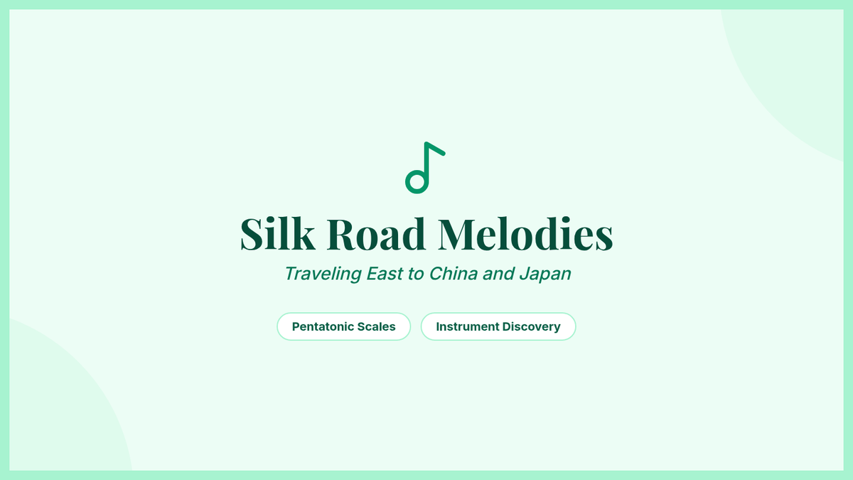 Visual presentation slides for Lesson 2, exploring the Silk Road, the Pentatonic scale, and traditional instruments like the Koto and Erhu.