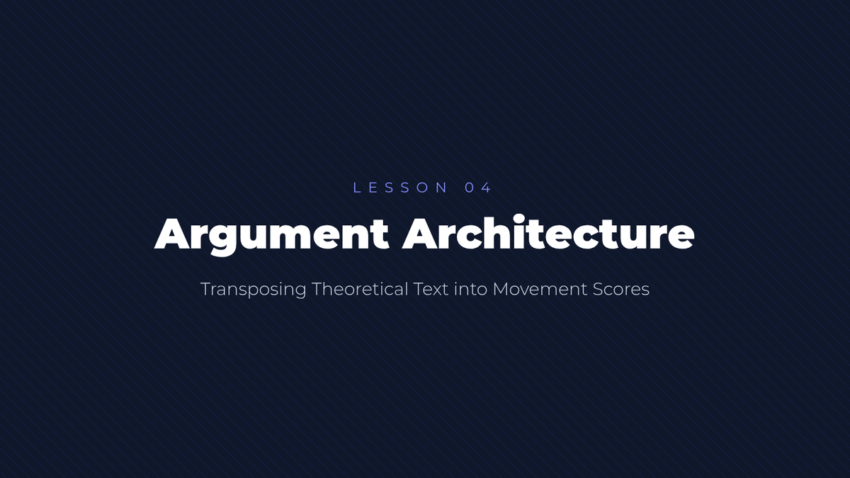 Introductory presentation for Lesson 4, exploring the transposition of theoretical texts into choreographic scores for research analysis.