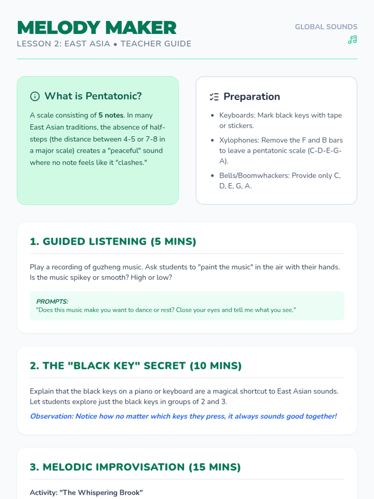 A teacher guide for the East Asian music lesson, focusing on setting up pentatonic instruments and facilitating melodic improvisation for Kindergarteners.