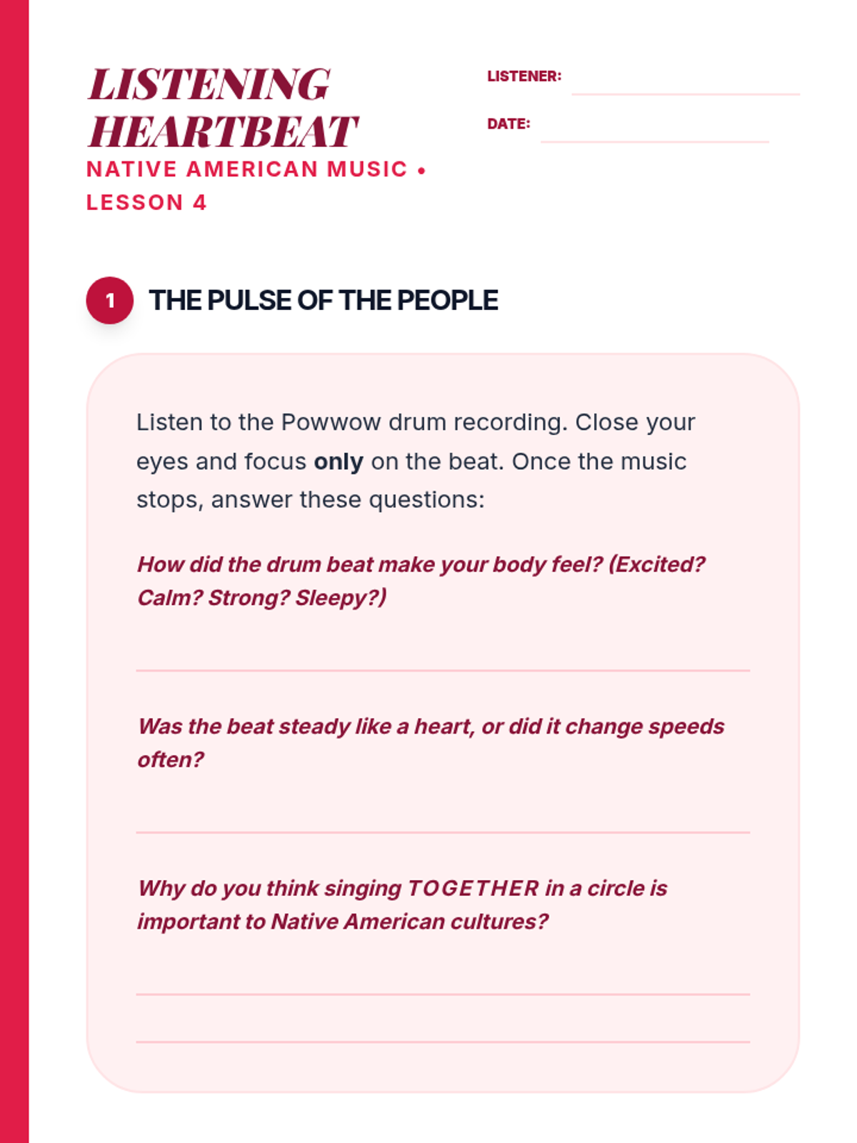 Student reflection worksheet for Lesson 4, featuring listening questions for Powwow music, vocabulary matching, and a creative response on cultural preservation.