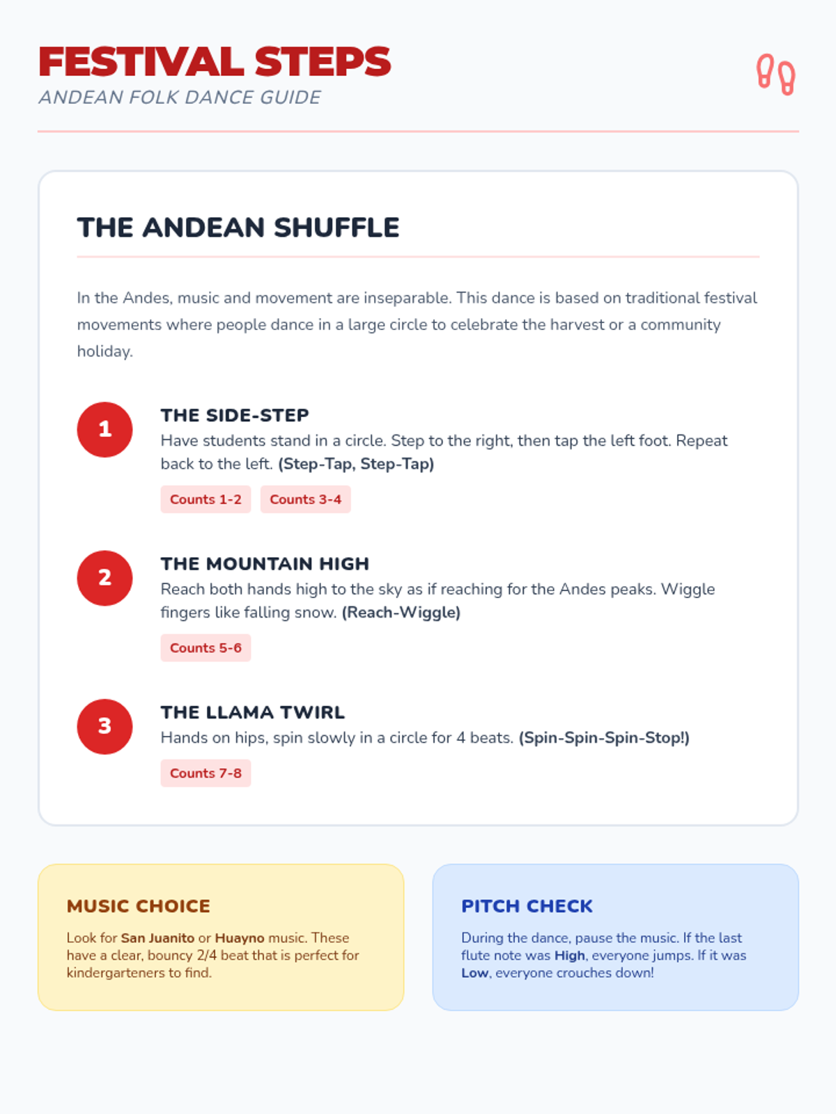 A teacher facilitation guide for teaching a simple Andean-inspired folk dance to Kindergarteners, focusing on rhythm and movement.