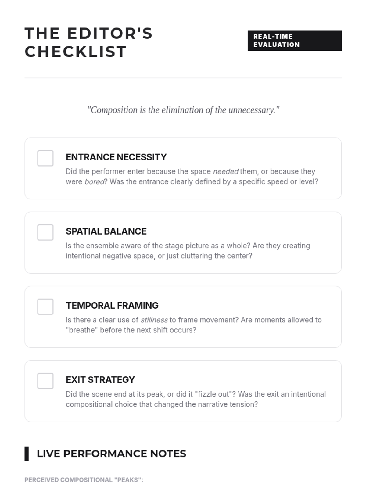 A checklist and note-taking template for graduate students to evaluate compositional rigor and real-time editing in ensemble improvisation.