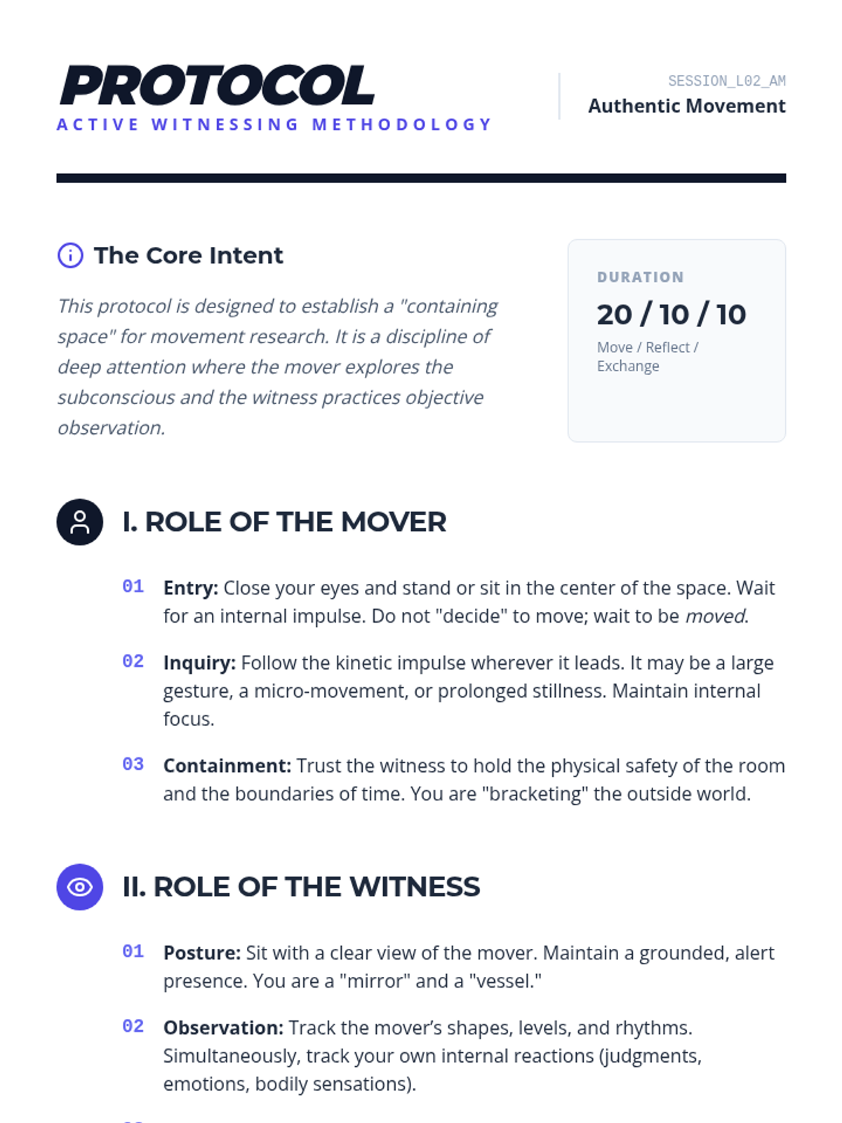 Protocol guide for the Mover/Witness discipline in Authentic Movement, including specific linguistic frames for the feedback loop.