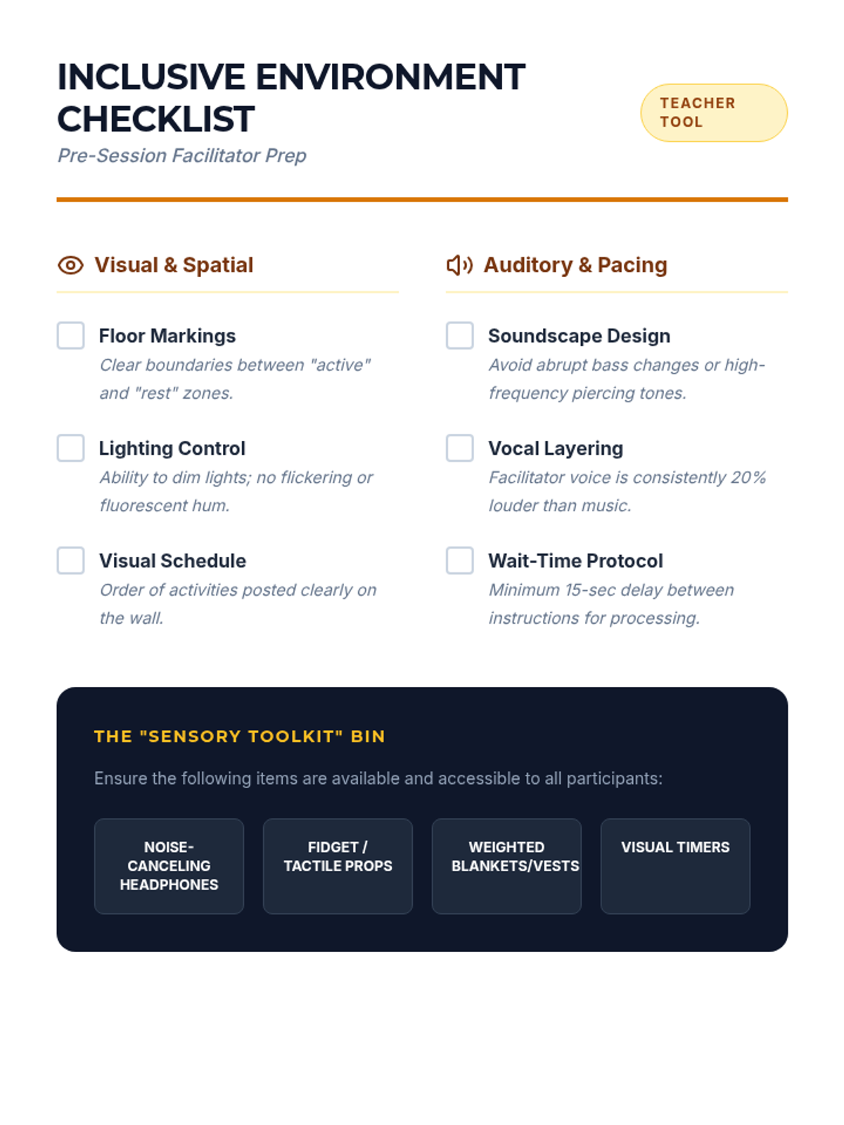 Checklist for movement facilitators to ensure their environment and teaching practices are inclusive of neurodiverse movers.