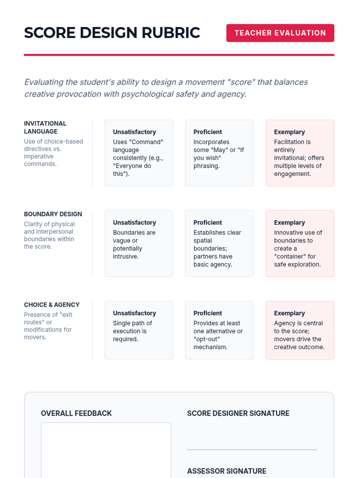 Teacher evaluation rubric for assessing the trauma-informed design of movement scores.