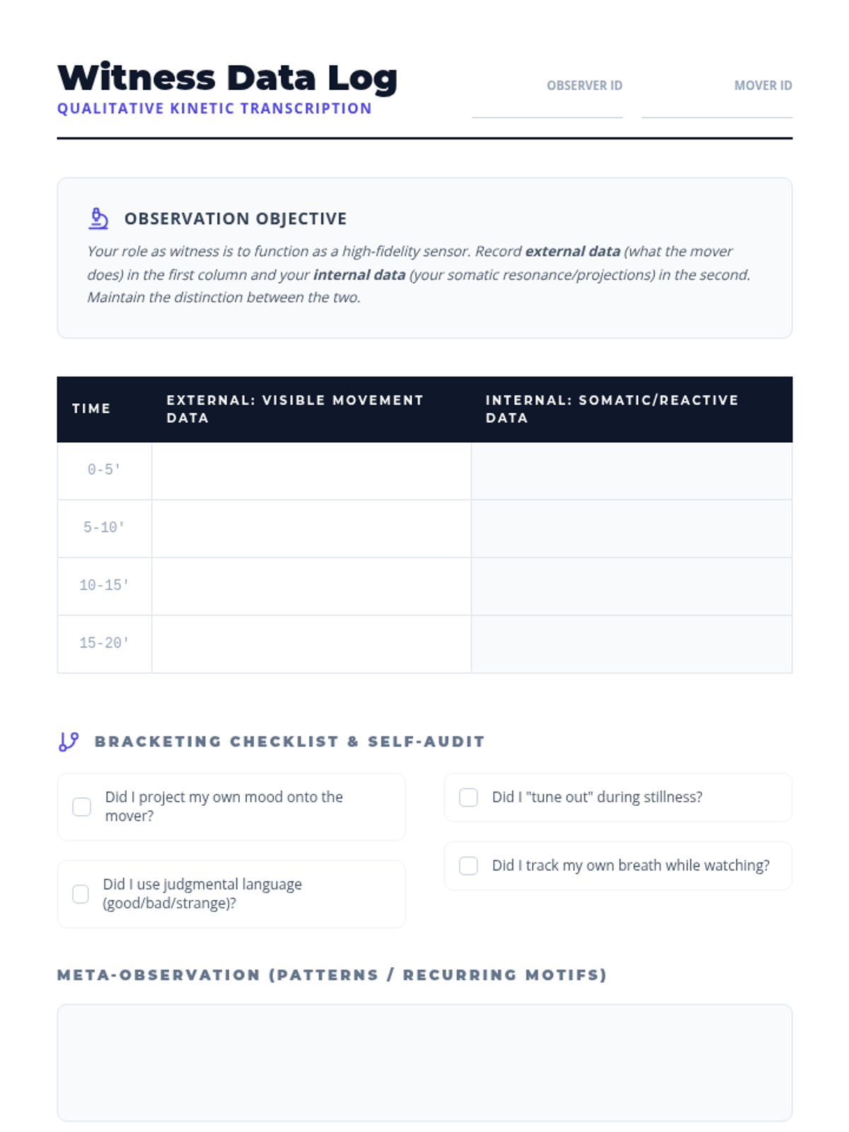 Observation sheet for the Mover/Witness discipline in Authentic Movement, featuring structured columns for external data and internal witness responses.