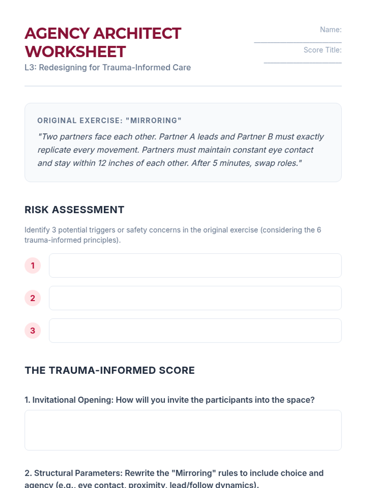 Worksheet for graduate students to analyze traditional improvisation exercises and redesign them using trauma-informed principles.