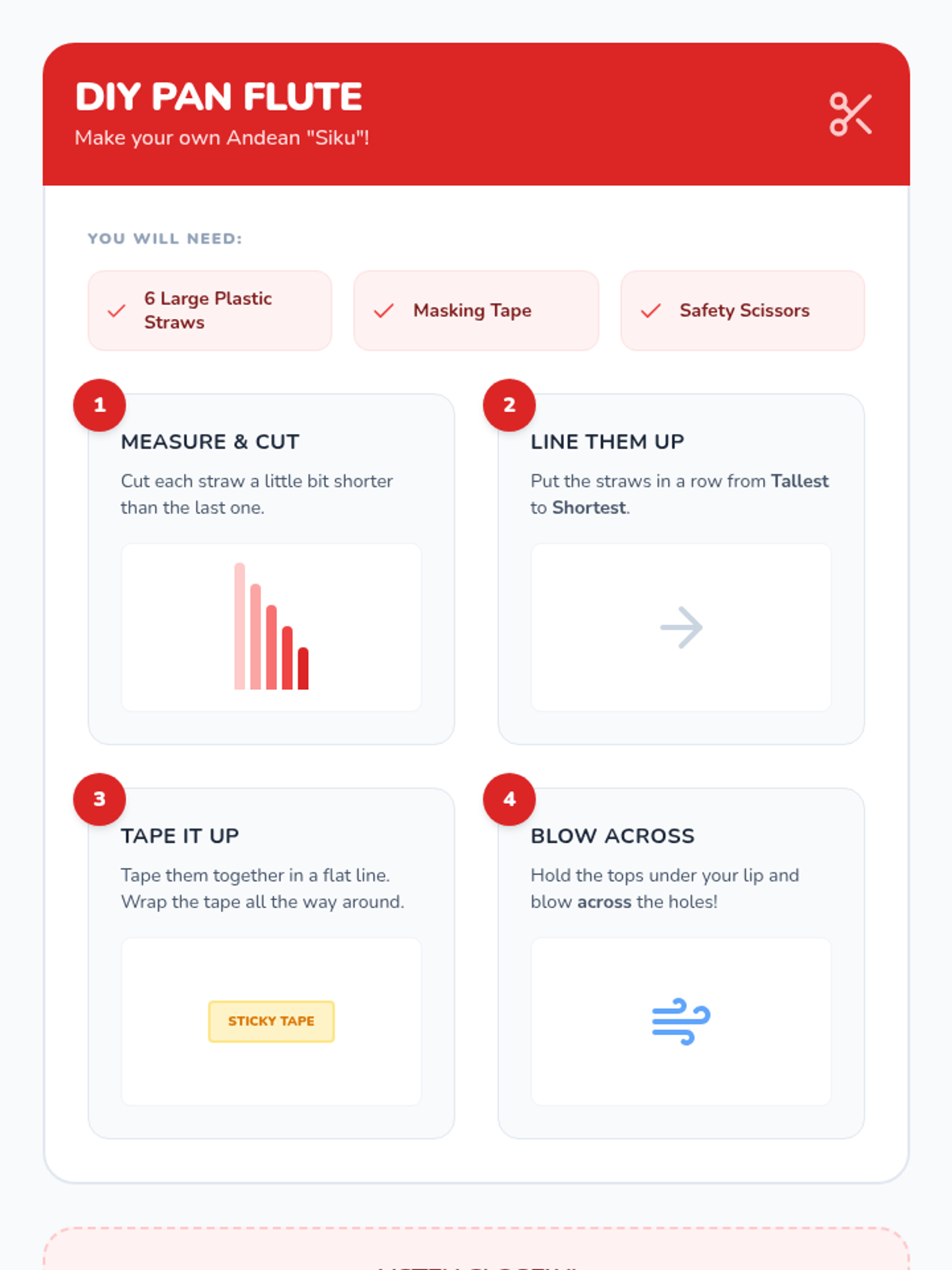 A visual, step-by-step guide for Kindergarteners to create a DIY pan flute from straws, reinforcing concepts of pitch and length.