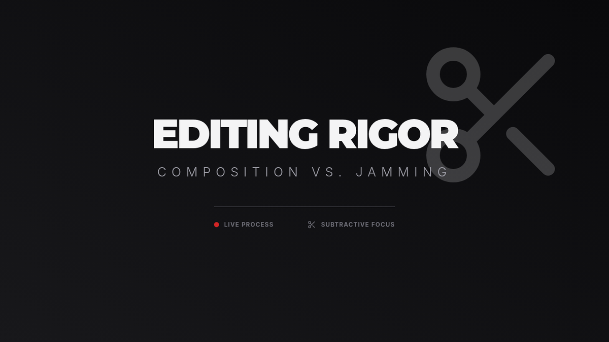 Slides for graduate students on real-time editing in improvisation, distinguishing compositional rigor from unstructured 'jamming.'