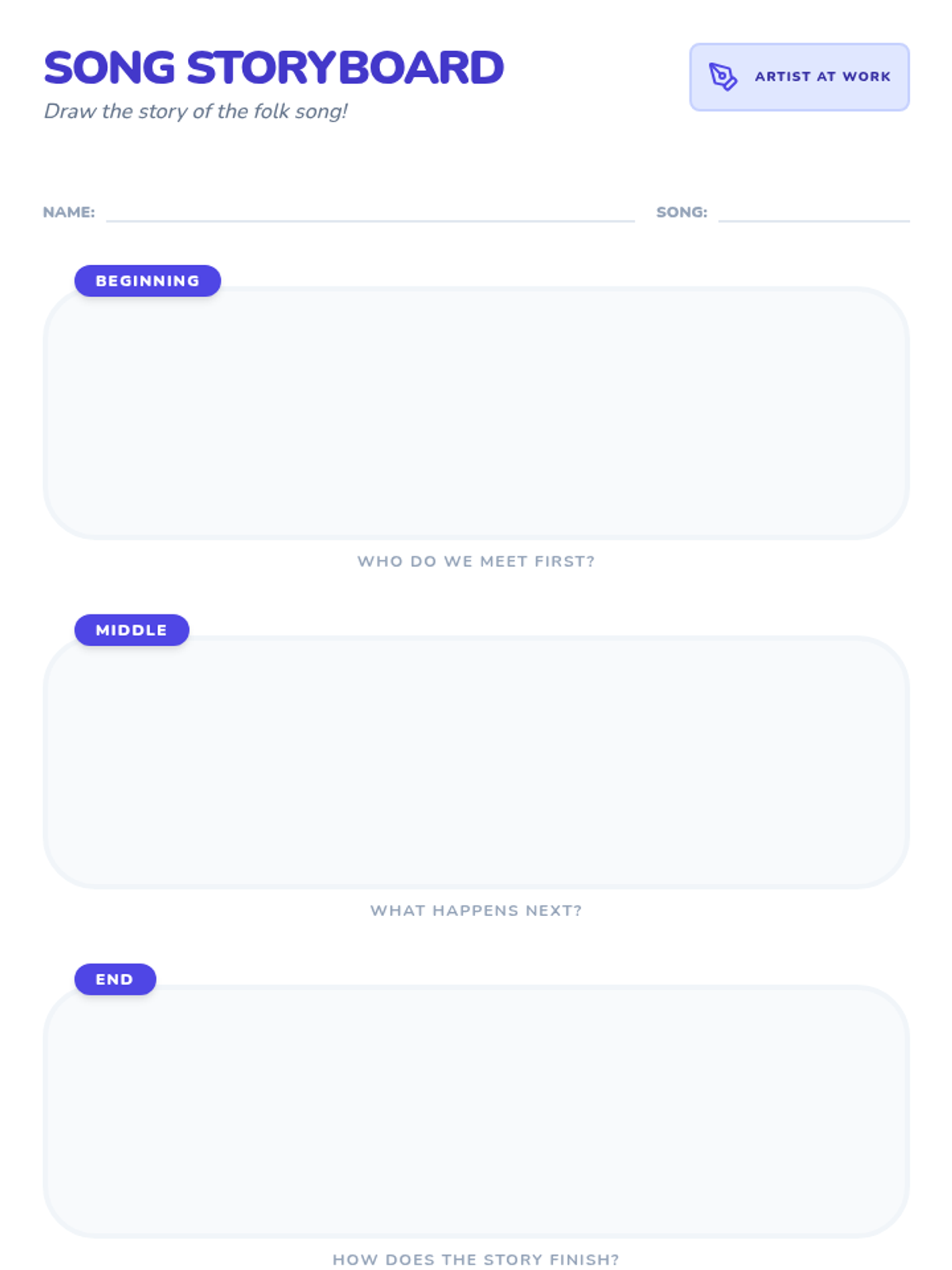 A student storyboard worksheet for North American folk music, where Kindergarteners draw the beginning, middle, and end of a song's narrative.