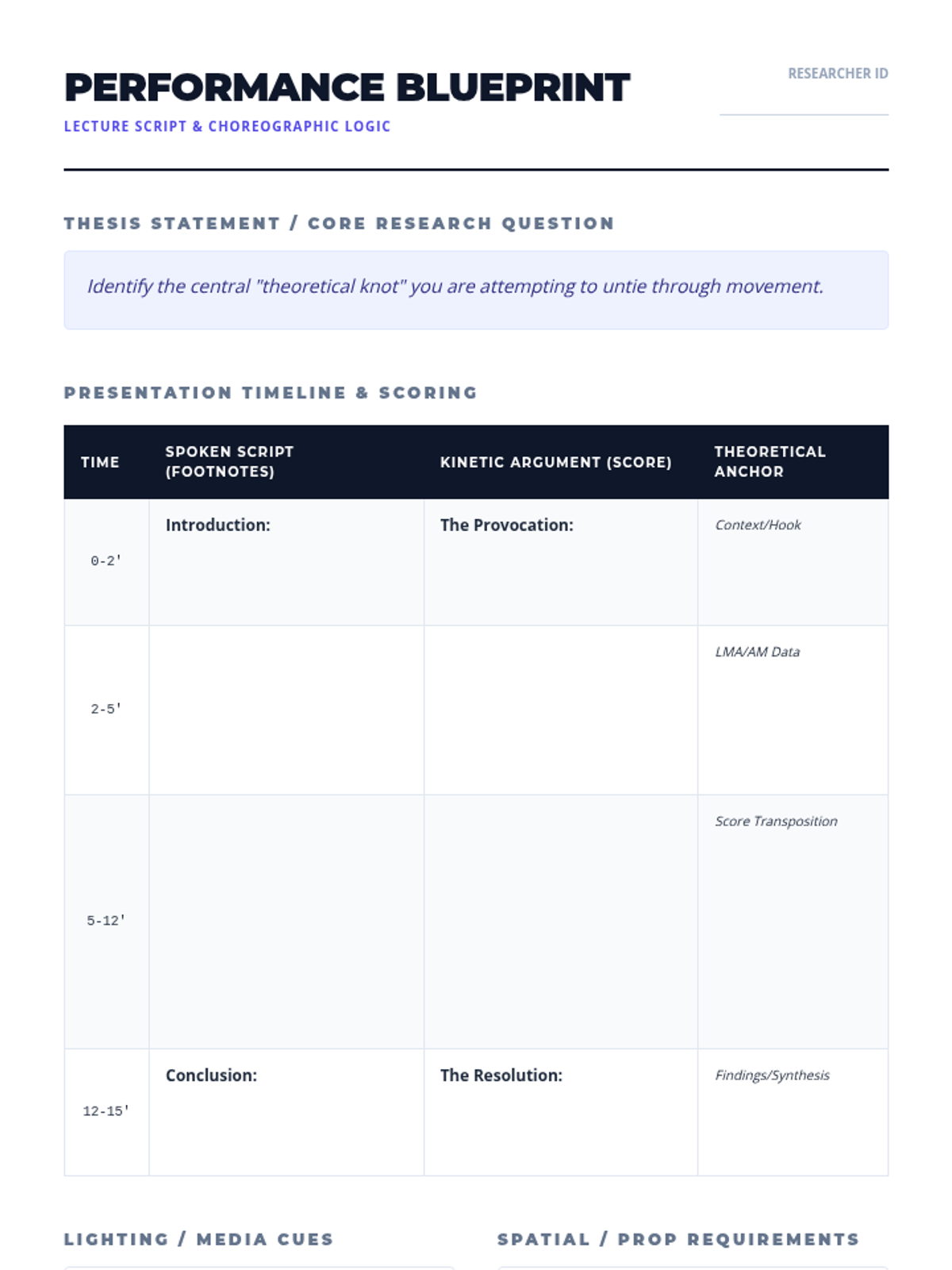 Planning worksheet for the final performance-lecture presentation, featuring a multi-column timeline for scripting and movement scoring.