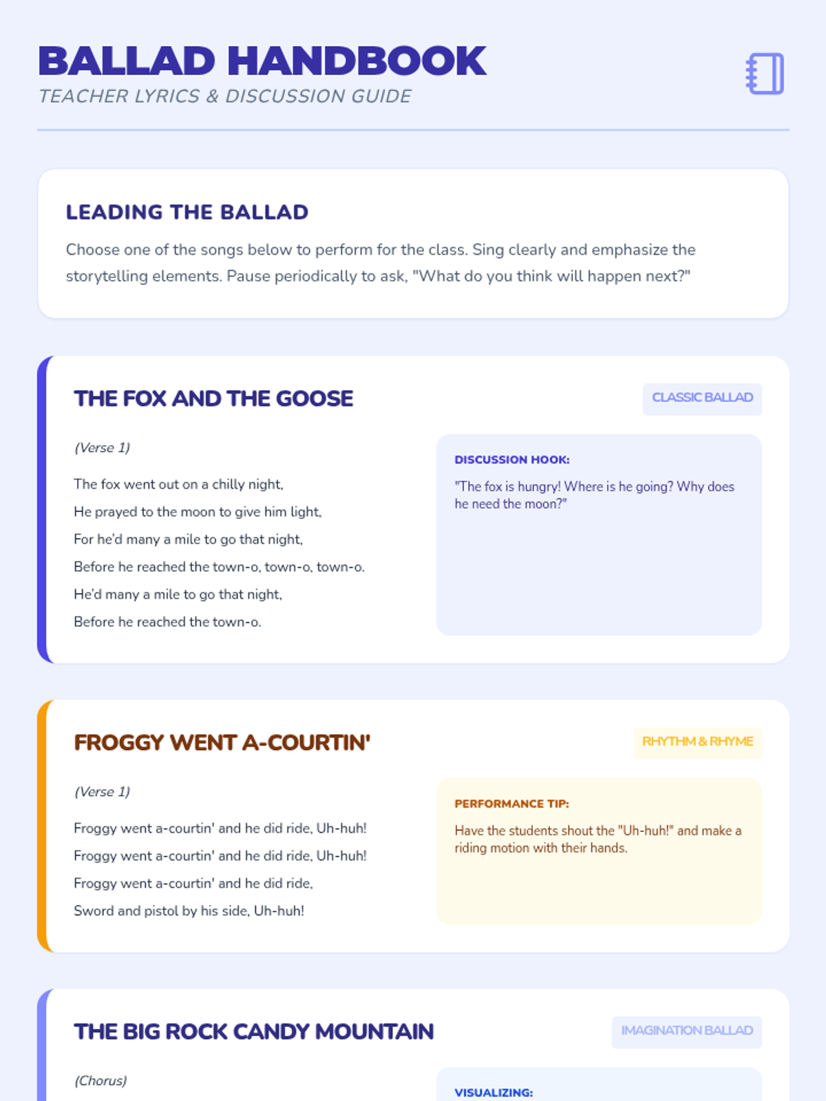 A handbook for teachers containing lyrics to classic North American folk ballads, performance tips, and discussion prompts for Kindergarteners.