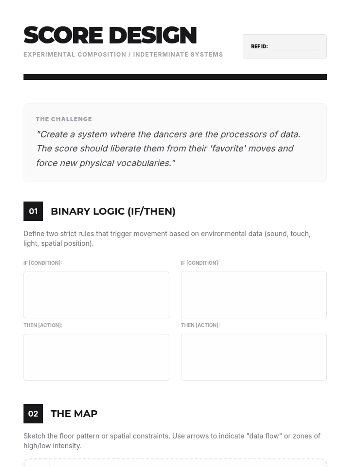 A structured template for graduate students to design and document their own indeterminate movement scores and algorithms.