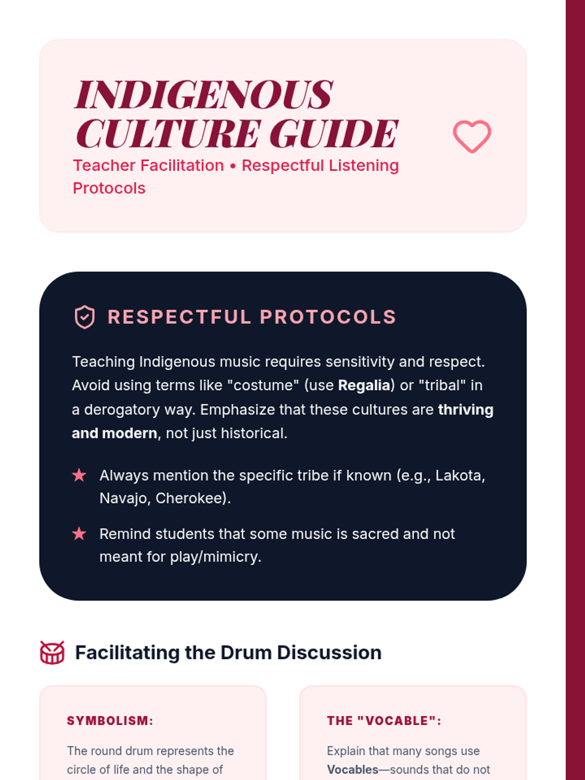 Teacher reference guide for Lesson 4, focusing on cultural protocols for teaching Indigenous North American music, key terminology, and listening facilitation strategies.