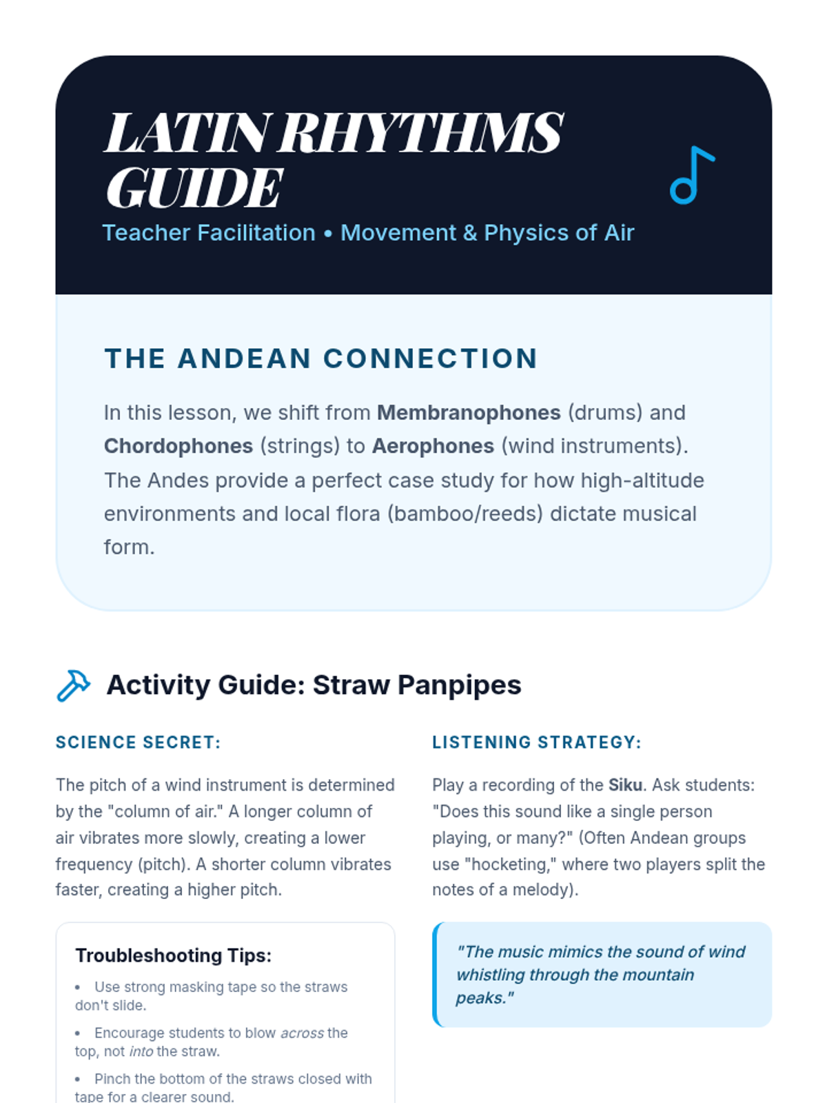 Visual presentation for the Andean music lesson, introducing the geography of the Andes, the mechanics of the pan flute (pitch and length), and traditional festival dance movements.