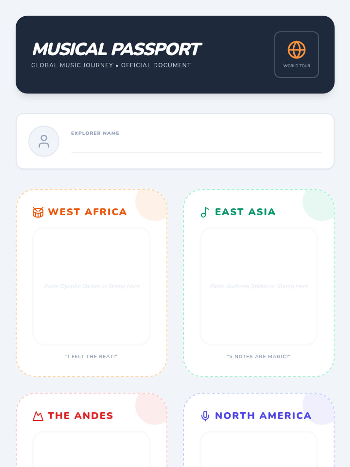 A cumulative activity sheet where Kindergarteners "stamp" their musical passports for each region studied in the sequence, reinforcing the geographical journey and key takeaways.