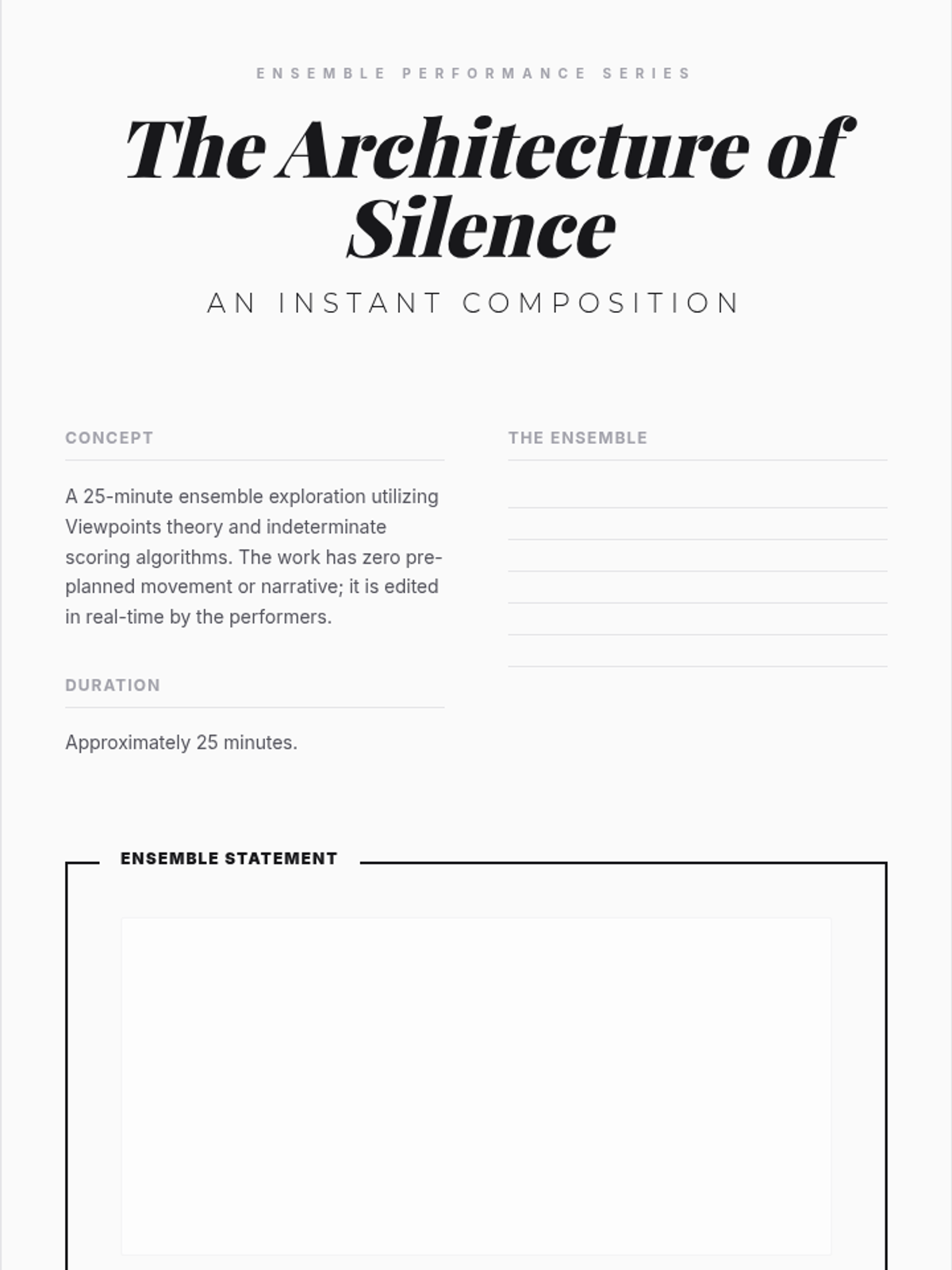 A sleek, minimalist program template for students to document their ensemble performance and list their specific movement scores.