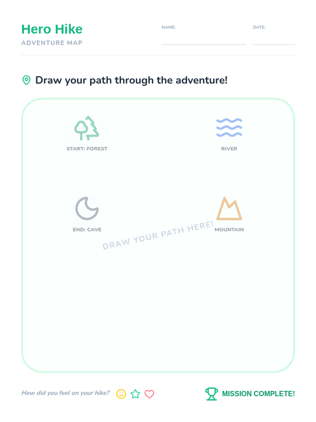 Worksheet for Pre-K students to map out their journey through the guided movement story adventure.