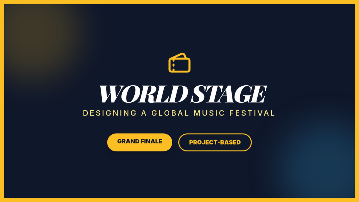 Student project planner for the "World Stage" festival, including budget tracking, a written pitch for a selected region, and a stage design blueprint area.