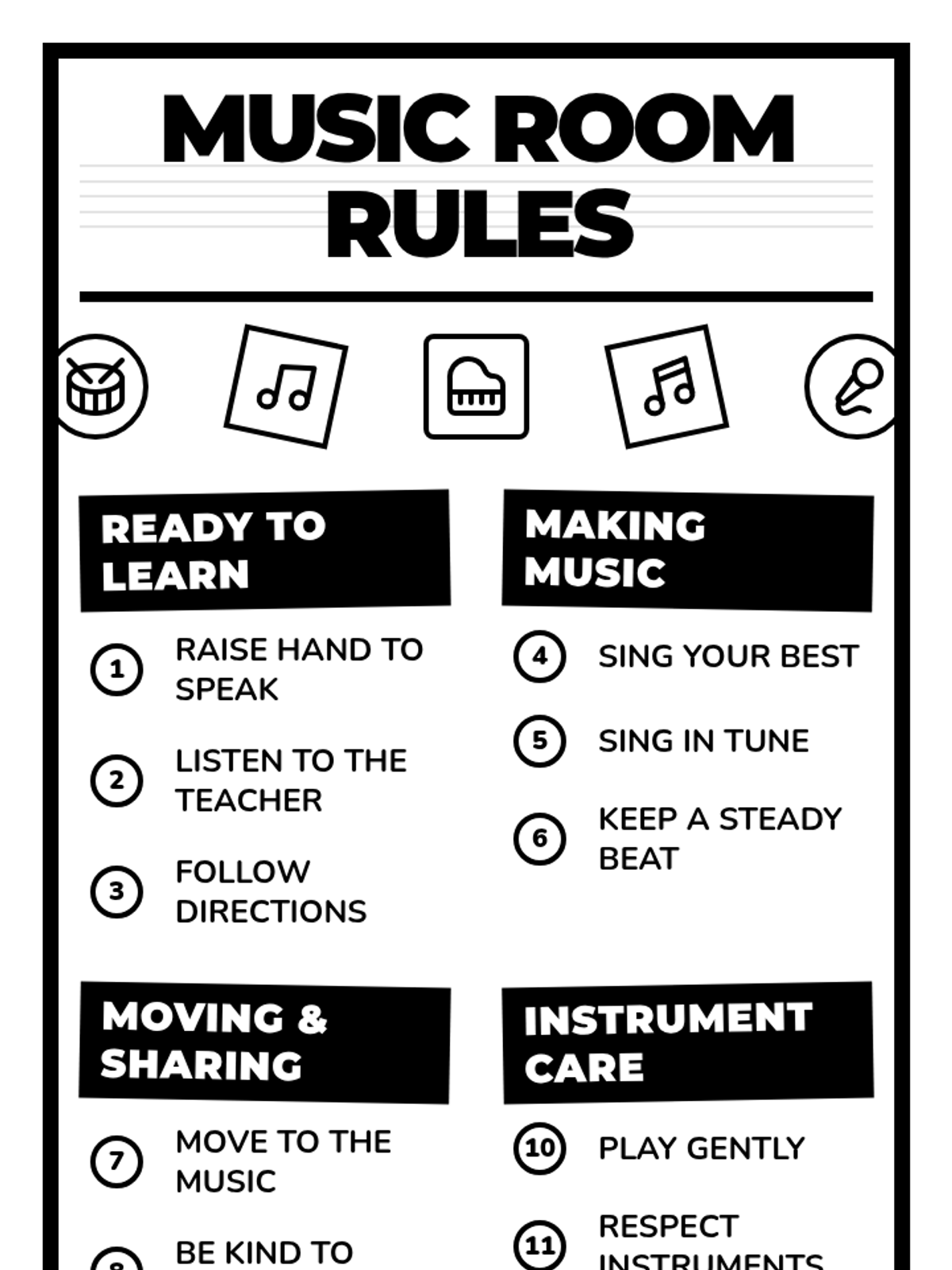 A high-contrast black and white music classroom rules poster designed for easy printing and coloring. It features 12 essential rules grouped into musical categories with decorative icons and space for students to personalize.