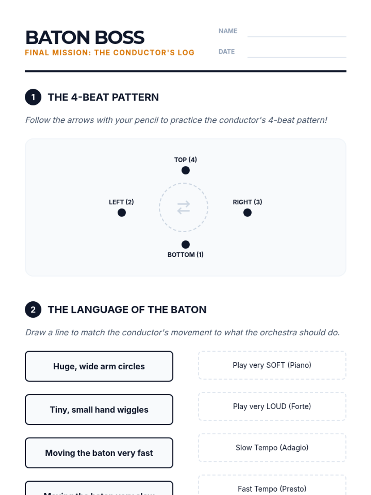 A student instructional guide for practicing basic conducting patterns (2/4 and 4/4) and understanding non-verbal cues.