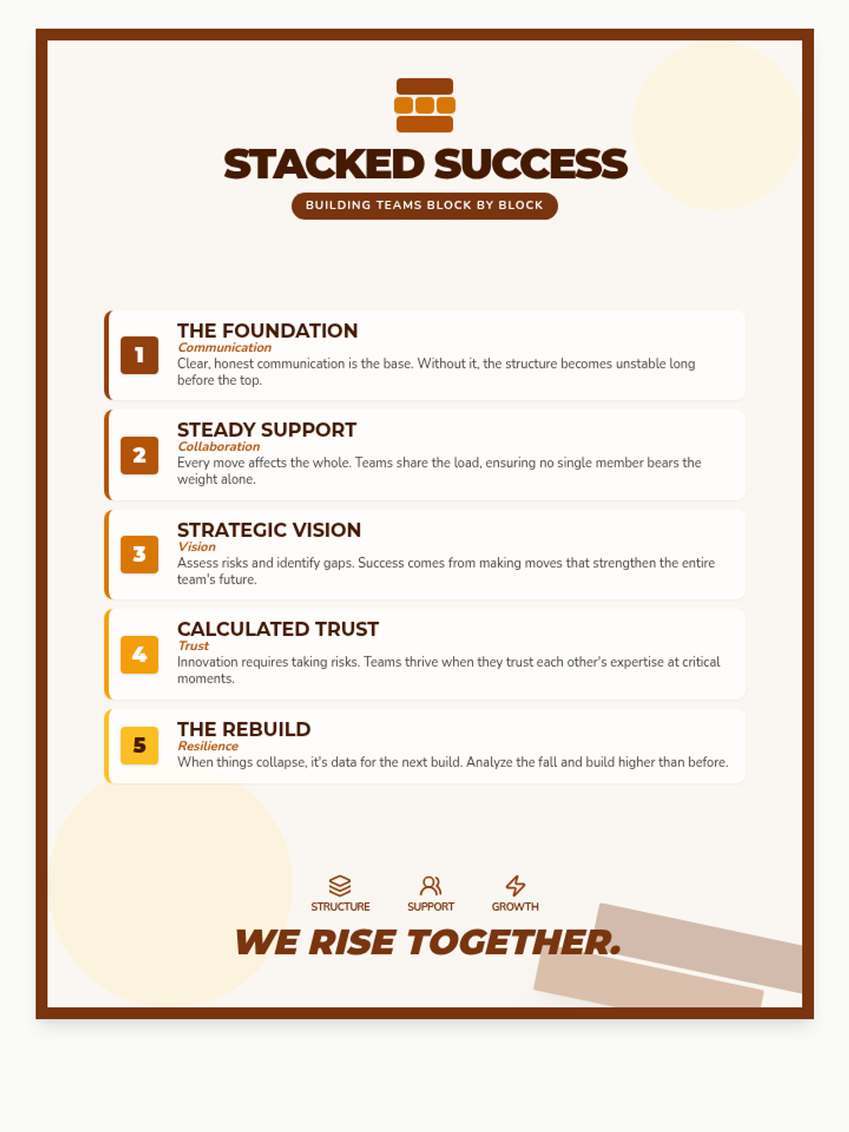 A polished poster connecting Jenga to team building, with a height carefully set to 840px within the 960px viewport to guarantee a single-page fit on US Letter paper without cutoffs.