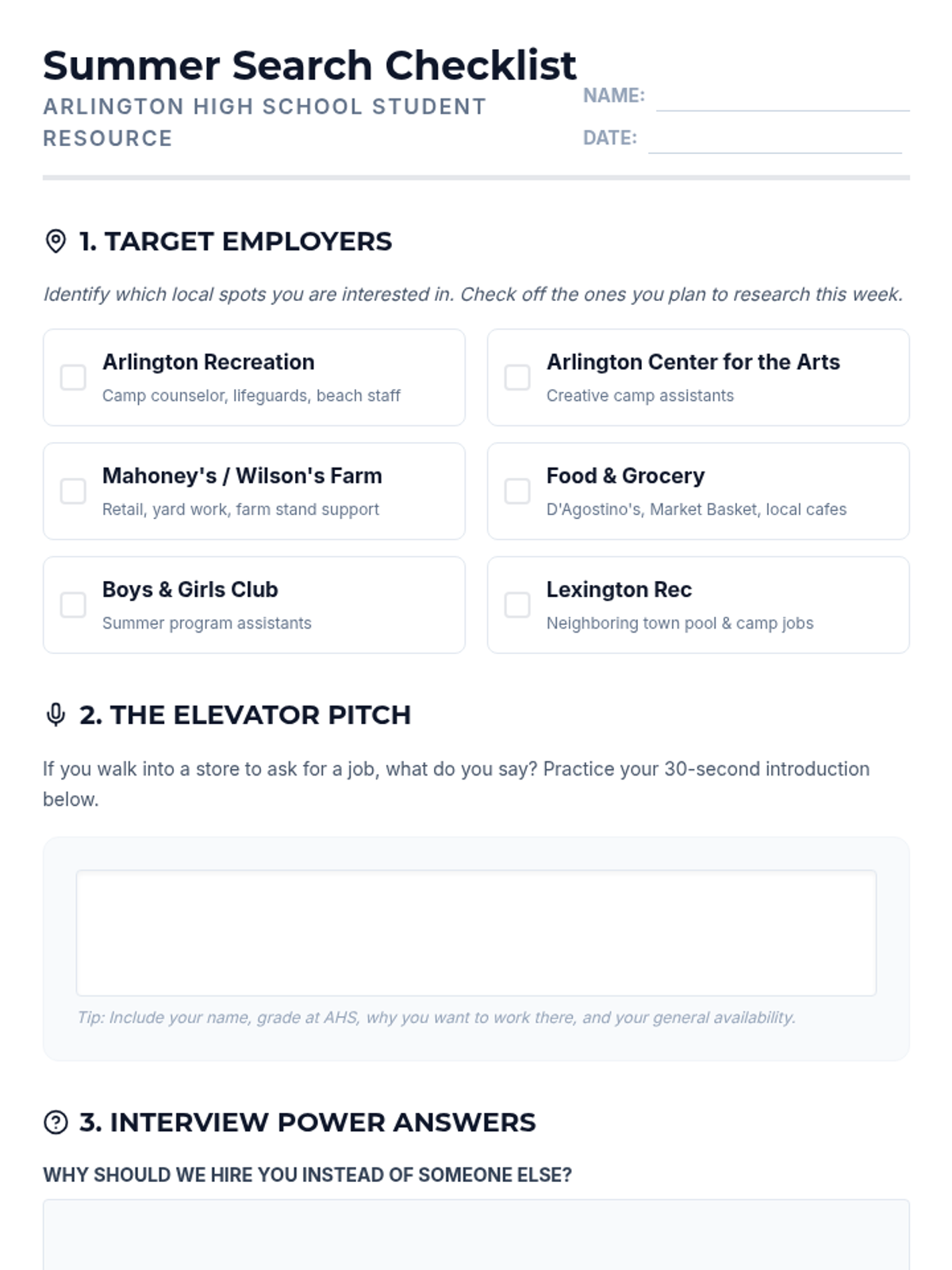 A student worksheet that provides a local employer checklist, an interview preparation area, and an application tracker to help AHS students organize their summer job search. Updated to include D'Agostino's.